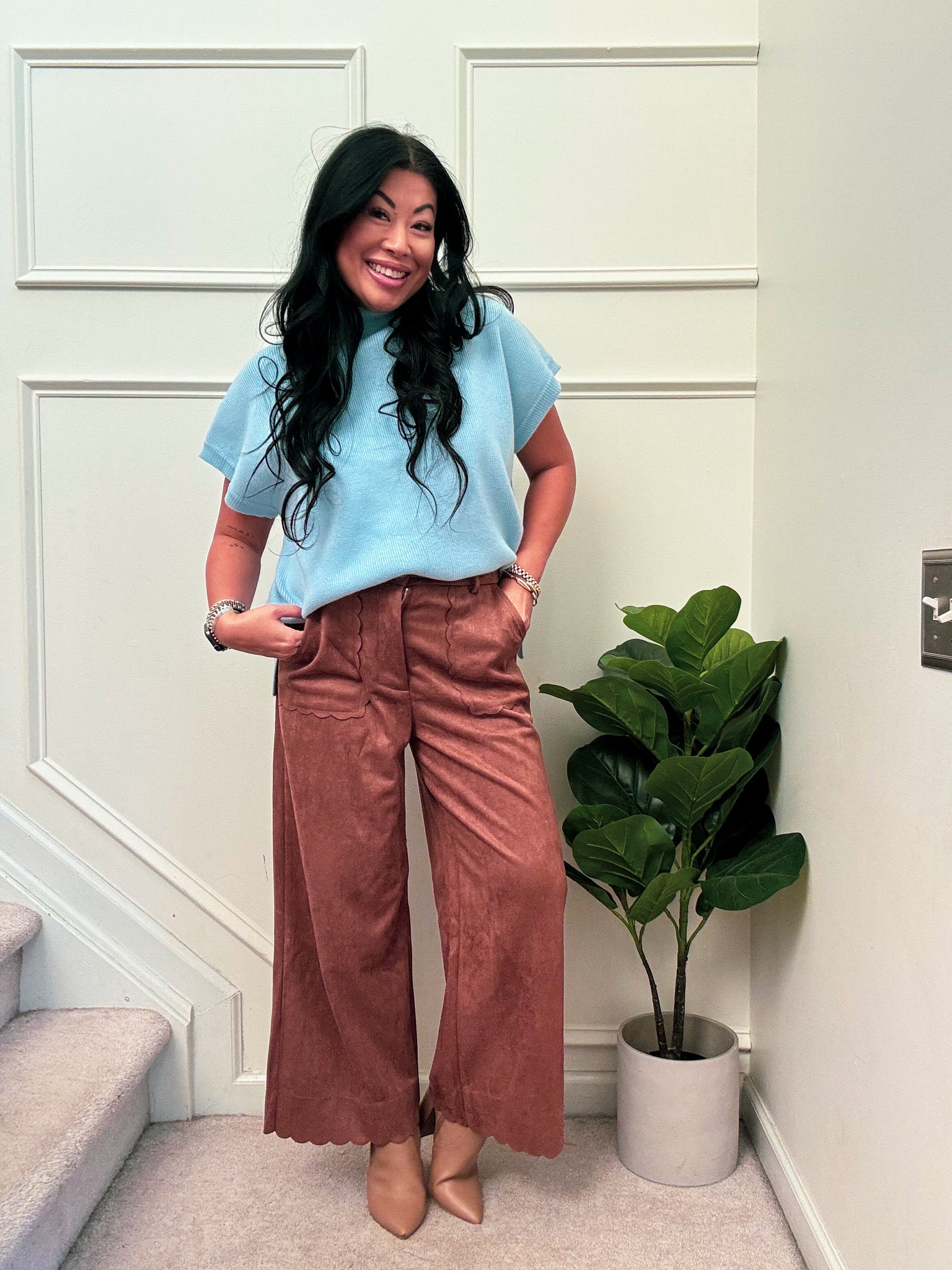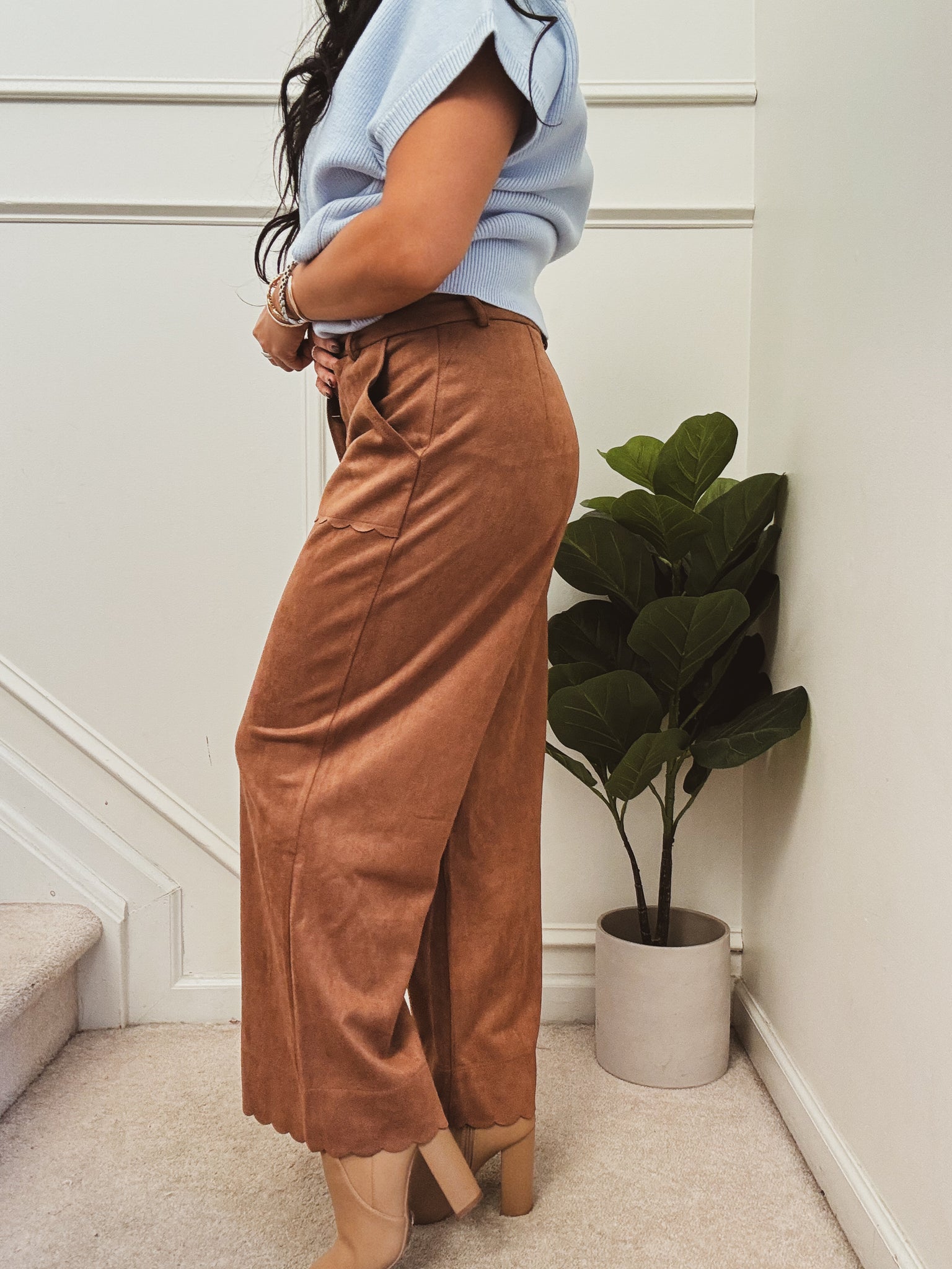 Wide-leg pants in a rich camel hue, crafted from ultra-soft faux suede for a drapey, elevated look with all-day comfort. A high-rise waist and fluid silhouette lengthen the leg, while scalloped edging at the front overlay and hem adds a feminine, statement finish. Functional side pockets and a concealed zip-and-button closure keep the profile clean. Dress them up with heels and a blouse or down with a cozy knit—these standout trousers bring texture, movement, and polish to any outfit.
