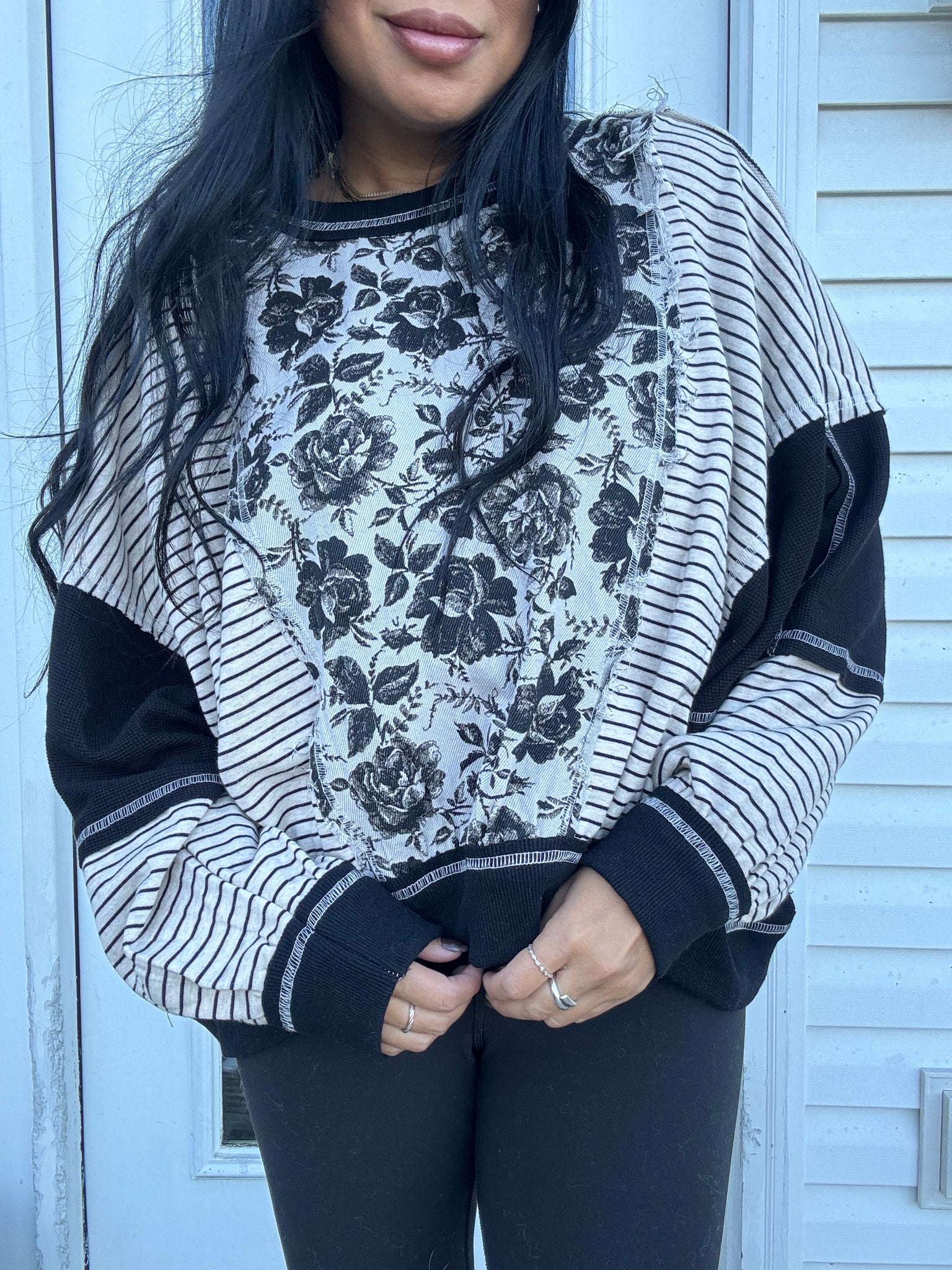 Cozy mixed‑media pullover sweatshirt featuring a striking black‑and‑white patchwork design. A floral front panel is framed by slim stripes and solid black blocks with exposed seam details for a modern, artsy finish. Crafted from a soft, mid‑weight knit, it delivers easy comfort with a relaxed, oversized silhouette and drop shoulders. Finished with a classic crew neckline, ribbed cuffs, and a banded hem, plus gently ballooned sleeves for added style. An effortless statement layer that pairs perfectly with leggings or denim for everyday wear, travel, or lounging. Machine‑washable convenience and three‑season versatility.