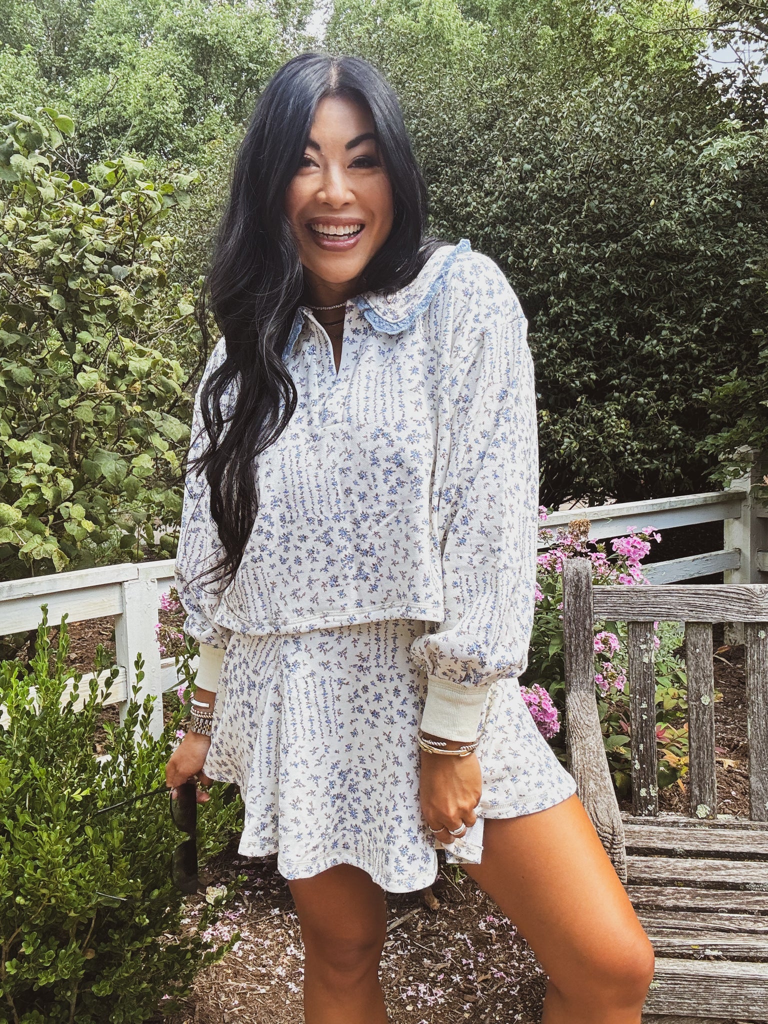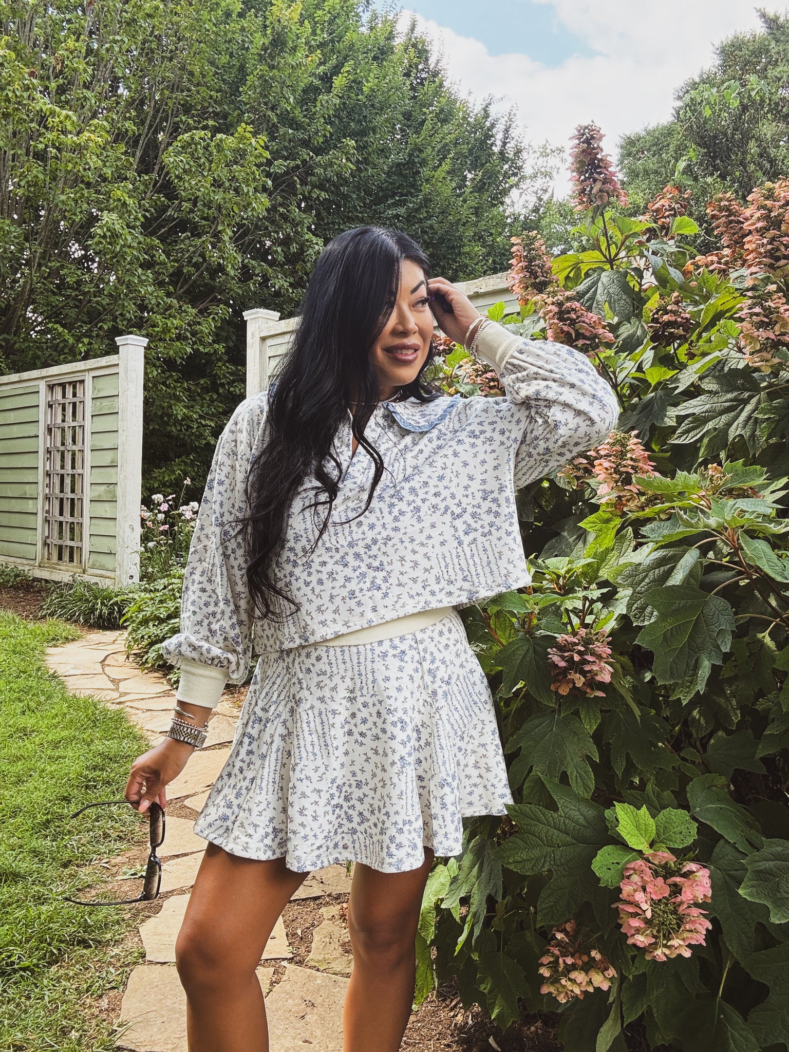 Embrace effortless charm and everyday comfort with this floral print skort, perfect for casual outings or laid-back summer gatherings. Crafted from a soft, breathable fabric, the skort features a delicate all-over pattern of blue flowers on a light cream base, offering a fresh and feminine look. The classic fit includes stretchy shorts underneath the flares that moves gracefully with every step. A wide, comfortable waistband adds structure and accentuates the silhouette, while the lightweight design ensures all-day ease. Ideal for pairing with sandals or sneakers, this dress is your go-to for a stylish, comfortable, and effortlessly chic appearance.