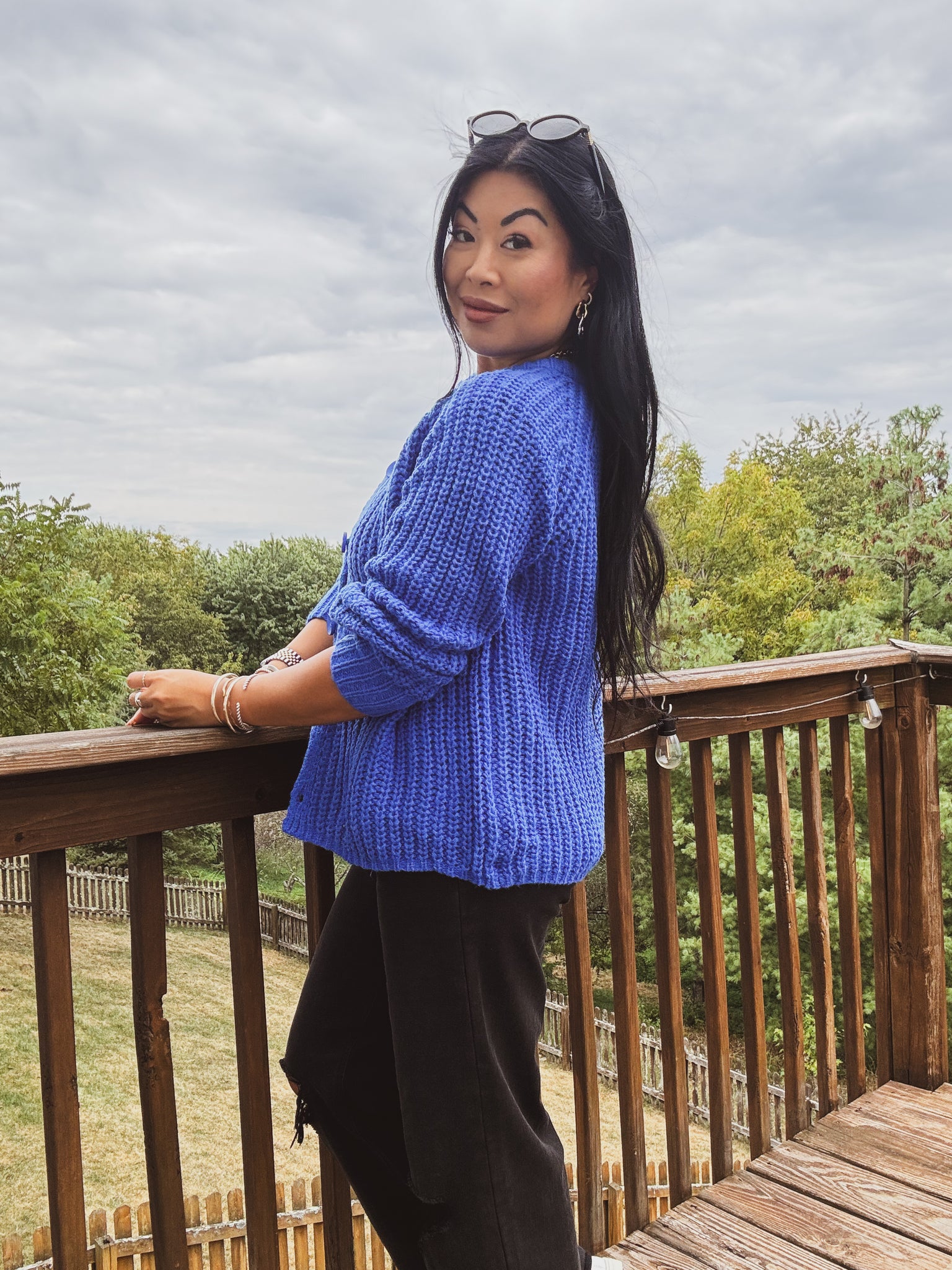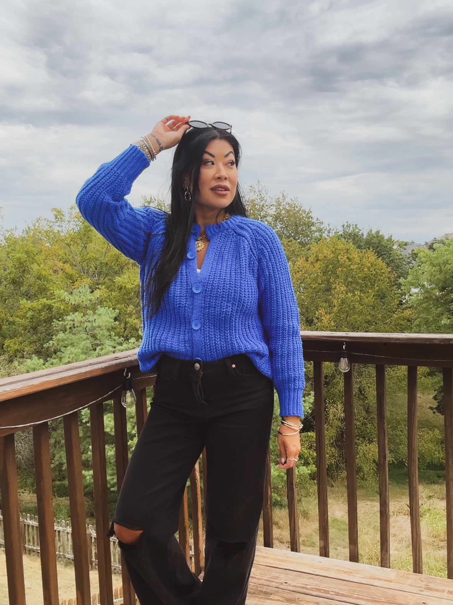 Kentucky blue chunky-knit cardigan with a cozy, textured waffle stitch and a modern silhouette. Designed with a crew neckline, long sleeves, and wide ribbed cuffs and hem for a polished finish. Features a button-front closure with oversized tonal buttons that add a playful, elevated touch. Subtle gathered detailing at the shoulders creates a flattering, softly structured shape without bulk. Wear it buttoned as a top or layered over tees and camis—an easy, warmth-giving staple that brightens everyday outfits and transitions effortlessly from work to weekend.