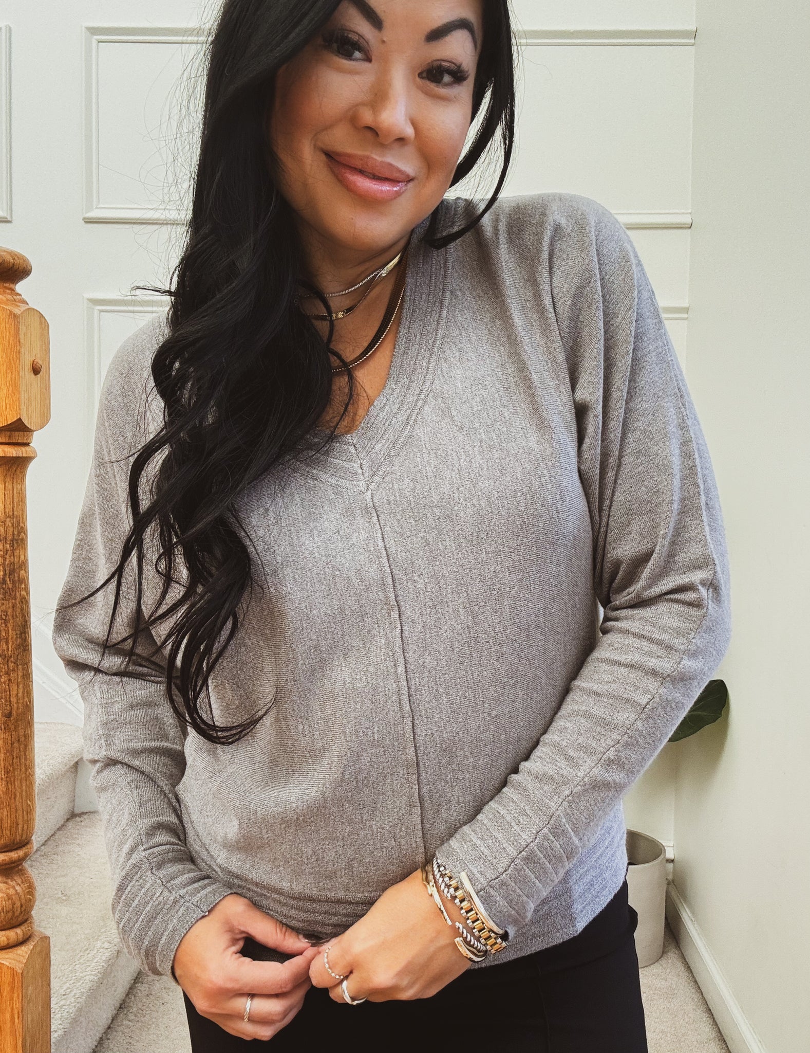 A heather-gray V-neck sweater designed for effortless polish and everyday comfort. Crafted from a soft, fine-gauge knit with gentle stretch, it drapes beautifully while keeping a lightweight feel. The relaxed silhouette features dolman sleeves that taper into ribbed cuffs for a flattering blouson effect, a clean center-front seam that subtly elongates the torso, and ribbing at the neckline and hem for a refined finish. Hip-length for easy tucking and layering, this versatile knit moves seamlessly from office to weekend—pair it with denim, trousers, or under a blazer for a sleek, cozy look.