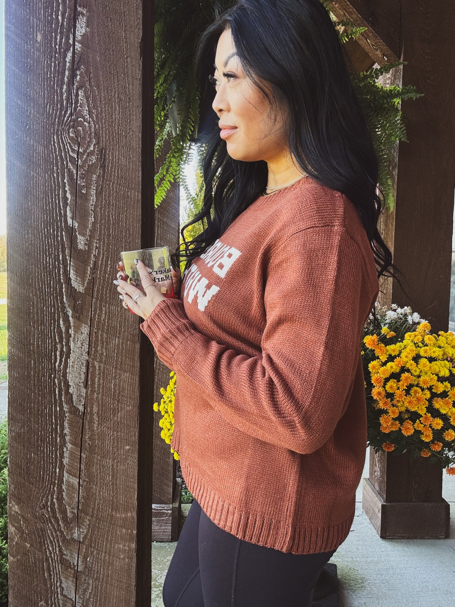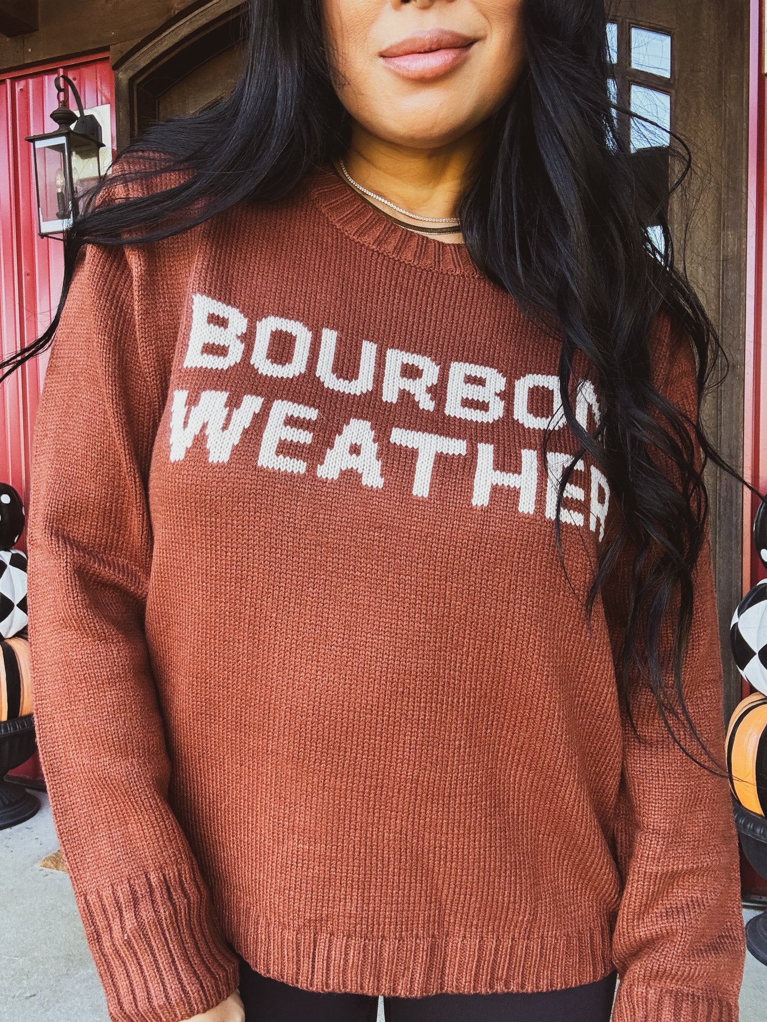 Cozy up in this playful “Bourbon Weather” sweater—your go-to knit for crisp fall and winter days. Made from a soft, mid‑weight knit, it features a classic crew neckline, full-length sleeves, and ribbed trim at the collar, cuffs, and hem for a comfortable fit. The rich rust/cinnamon hue pairs effortlessly with denim, leggings, or skirts, while the ivory, knit‑in block lettering adds a bold, tongue‑in‑cheek statement that’s perfect for tailgates, cabin weekends, and holiday gatherings. Designed with a relaxed, slightly boxy silhouette that hits at the hip, it layers comfortably over tees or button-downs without feeling bulky. A fun conversation starter and a great gift for bourbon lovers, this sweater blends warmth, personality, and everyday ease. Unisex fit. Runs relaxed.