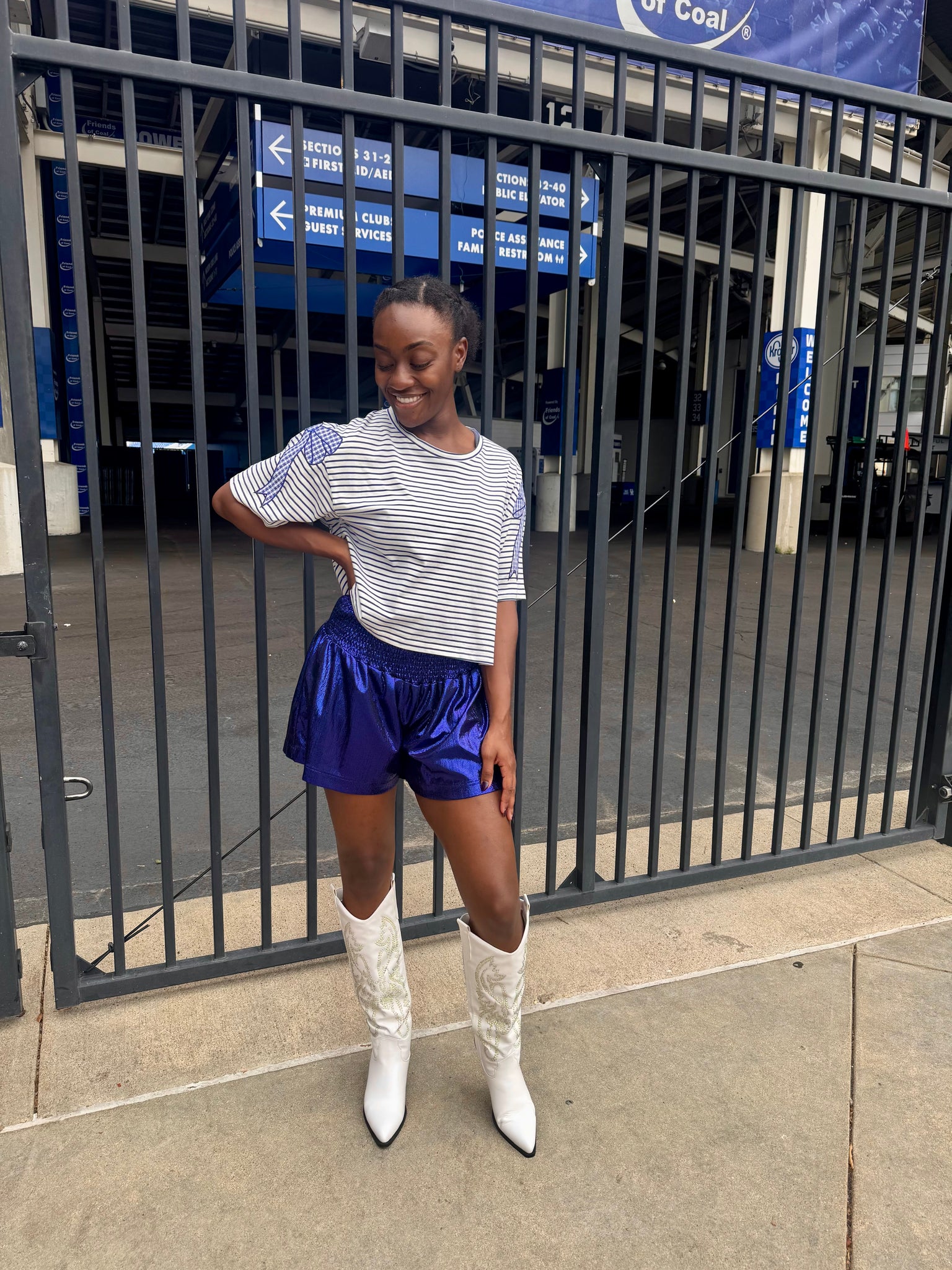 Elevate your casual wardrobe with this chic striped blouse, perfect for effortless summer style. Crafted from soft, breathable fabric, this top features classic navy blue and white horizontal stripes, lending a timeless nautical vibe. The standout detail is the statement bow on the sleeve, adding a playful and feminine touch to the overall design. Cut in a relaxed fit with elbow-length sleeves, it provides all-day comfort and ease of movement. Pair it with your favorite denim shorts for a laid-back look, or dress it up with skirts and accessories for a smart-casual ensemble. Ideal for brunches, picnics, or everyday wear, this blouse is a versatile addition to any fashion-forward closet.