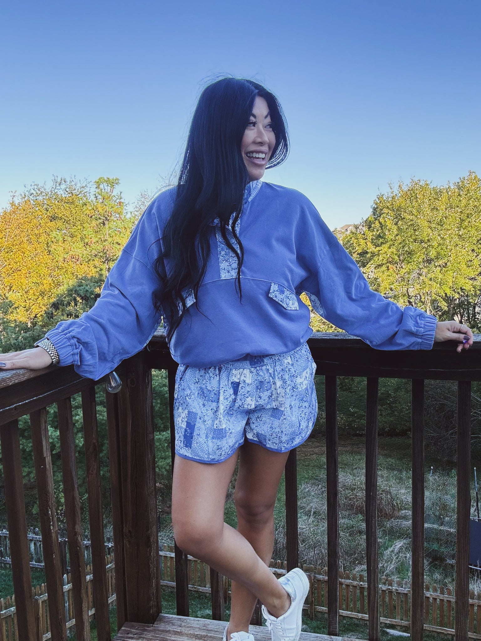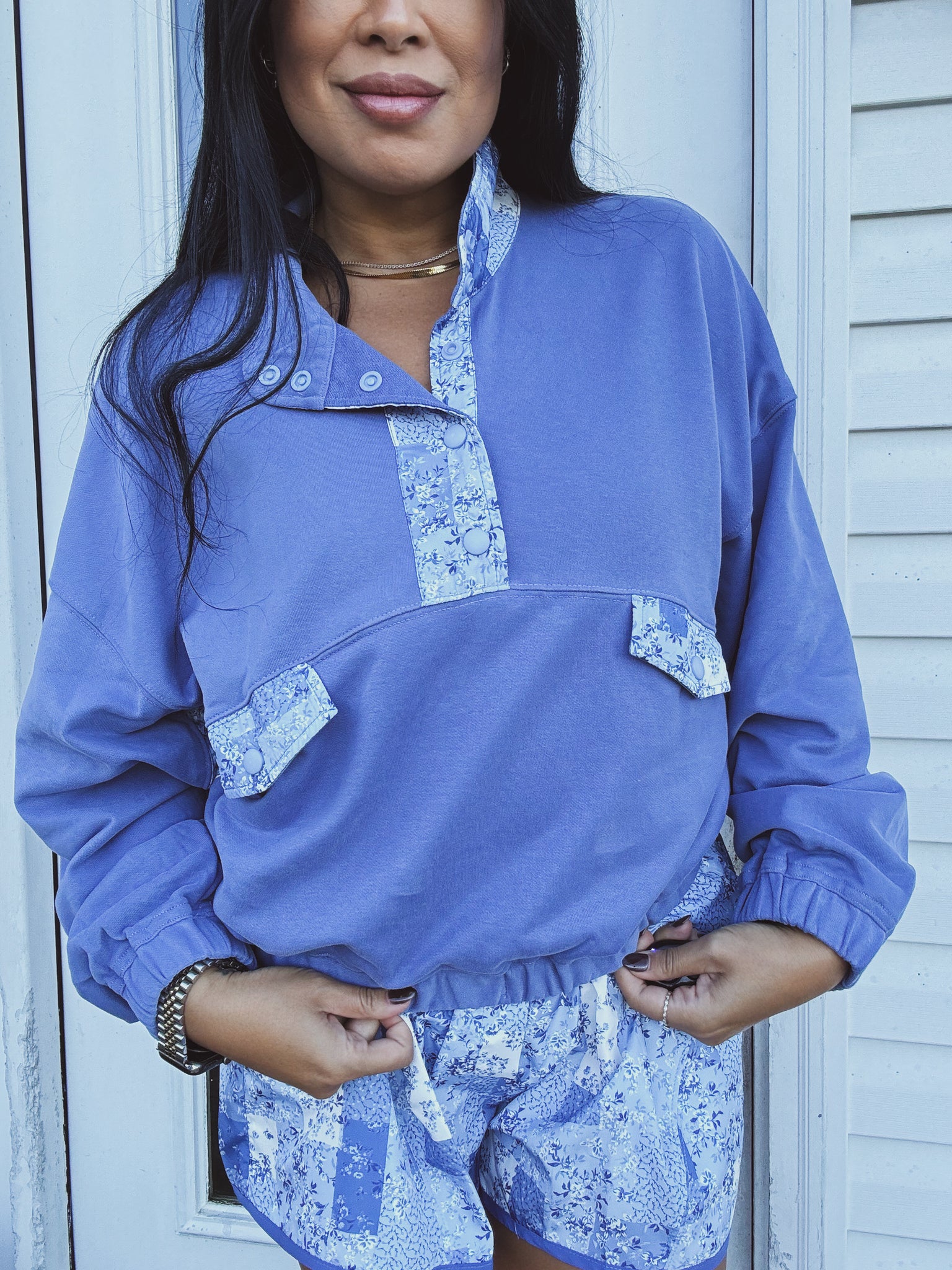 Cozy French Terry sweatshirt with feminine, vintage-inspired detailing. Crafted from a soft midweight knit, this relaxed layer features a stand collar and half-snap placket trimmed in a ditsy floral print for a subtle contrast. Matching floral-trim flap pockets at the front add utility style and small-item storage. Designed with drop shoulders, elasticated cuffs, and a gathered hem for a comfortable blouson silhouette that’s easy to layer. A versatile throw-on for casual days, travel, or weekend wear—pair with denim or the coordinating floral bottom for a set look. Key features: