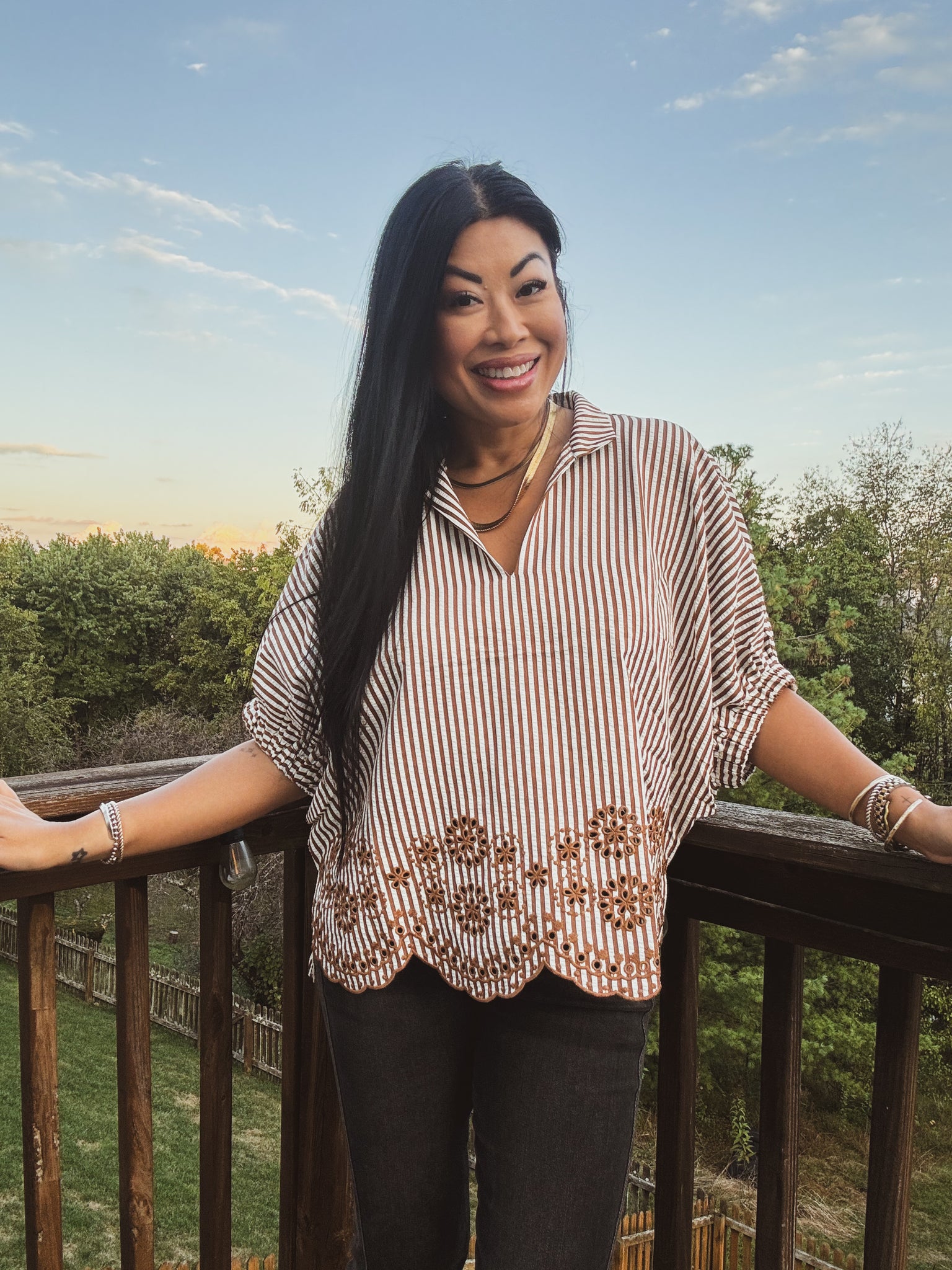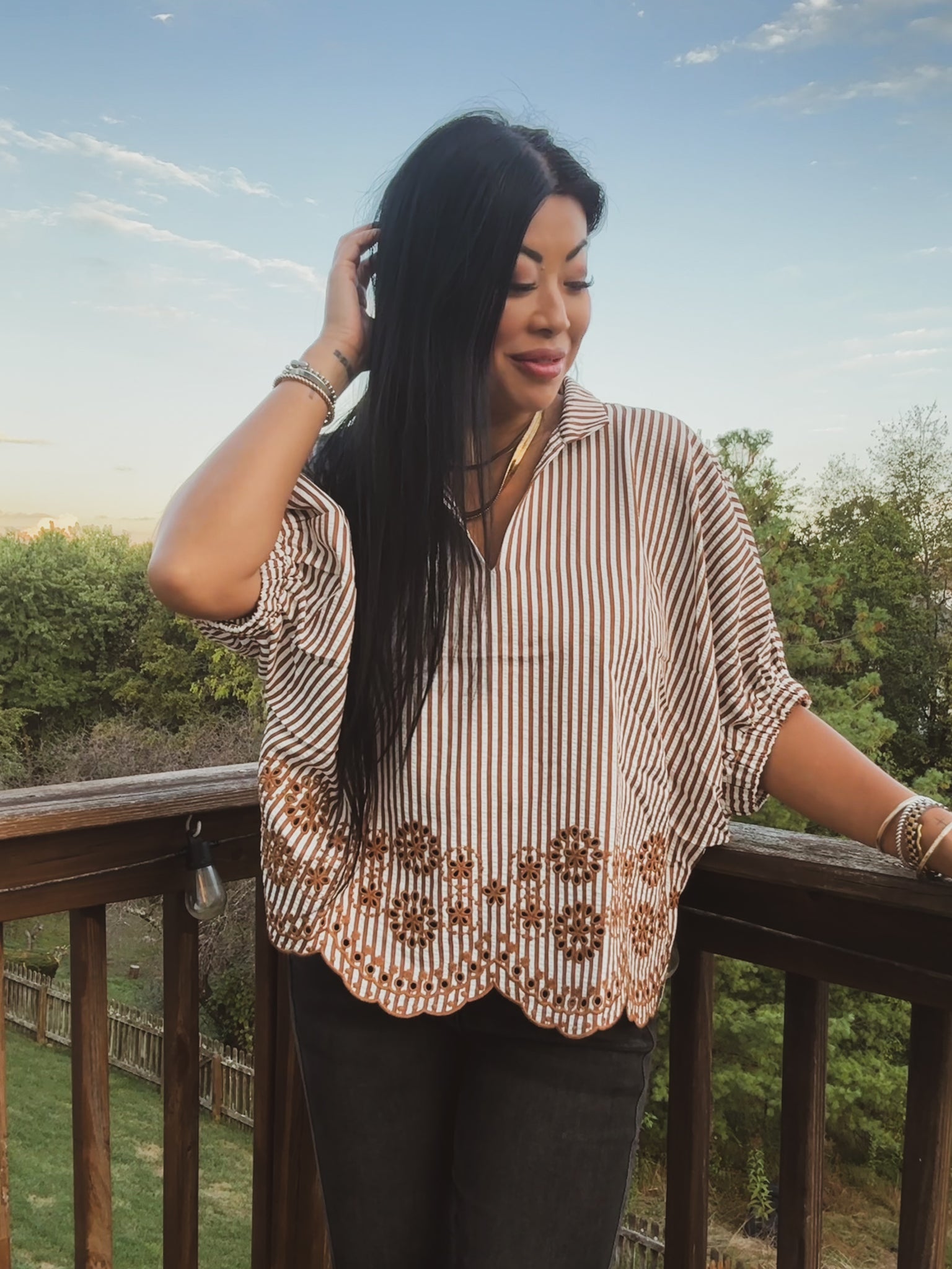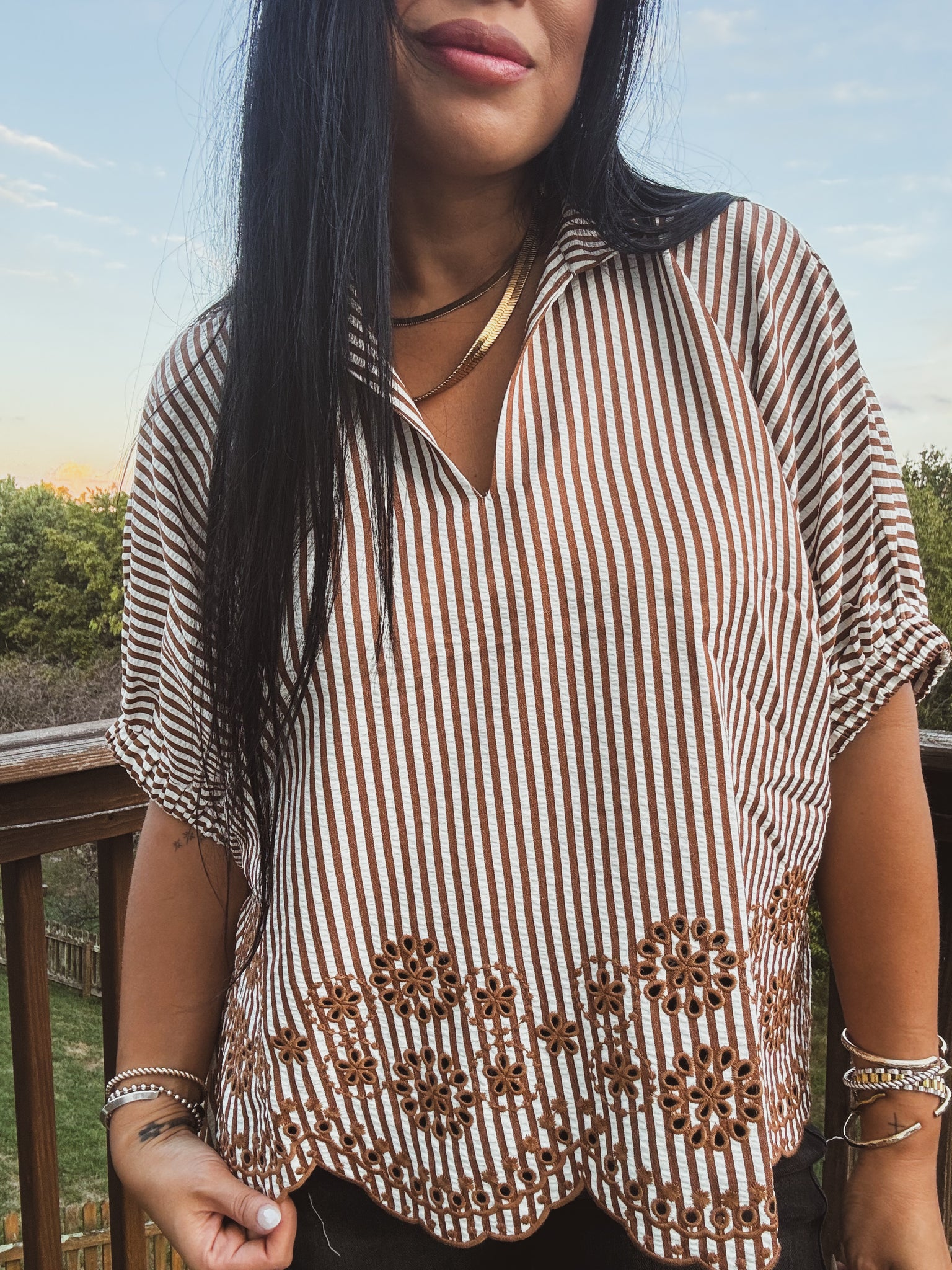Breezy striped popover blouse with feminine eyelet detail. Crafted from a lightweight, breathable woven fabric in crisp white with warm brown vertical stripes, this relaxed-fit top features a split V neckline with a soft collar, short dolman sleeves, and a hip-length silhouette. A scalloped hem is finished with intricate floral eyelet embroidery for a refined, boho touch. The pullover design ensures easy wear, while the vertical stripes create an elongating effect. Perfect for dressing up or down—pair with denim, shorts, or tailored trousers for effortless style.