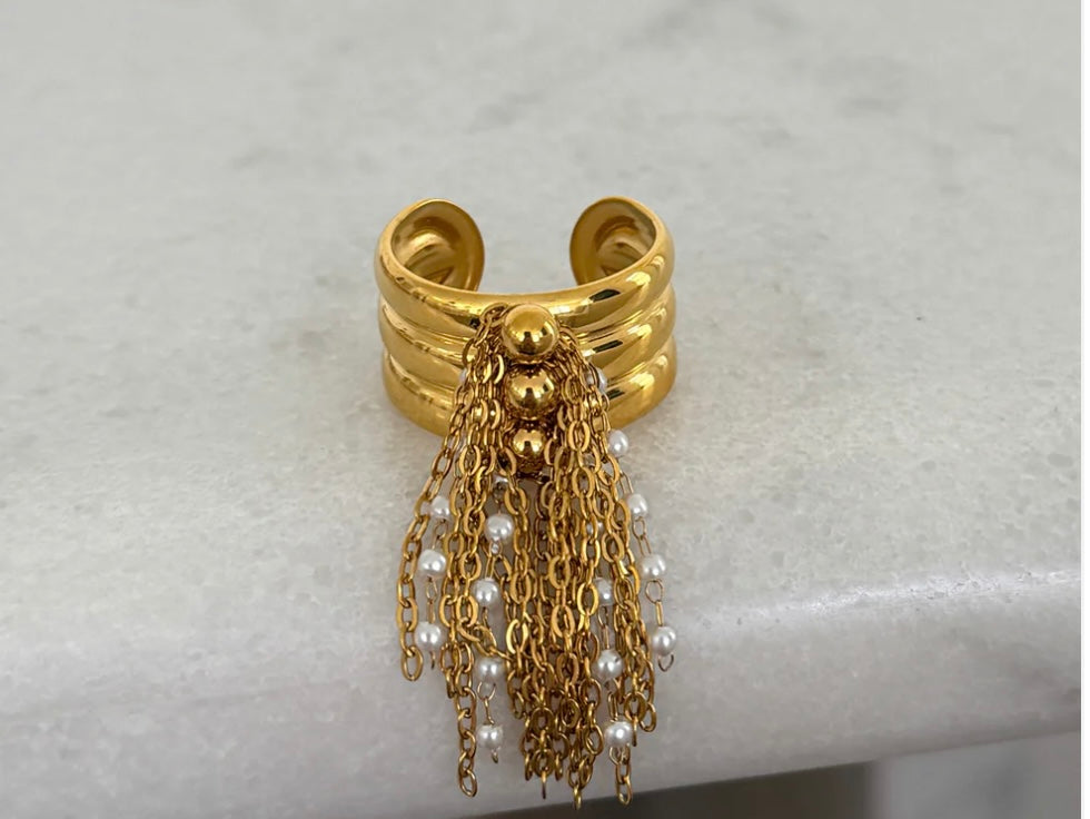 Add a little razzle dazzle to your jewelry collection with the Jade Ring. Thick, three banded stack ring with chain link and pearl dangle accent. Water resistant 18k gold plated stainless steel. Available in size 7 only, but adjustable by loosening and tightening the bands.