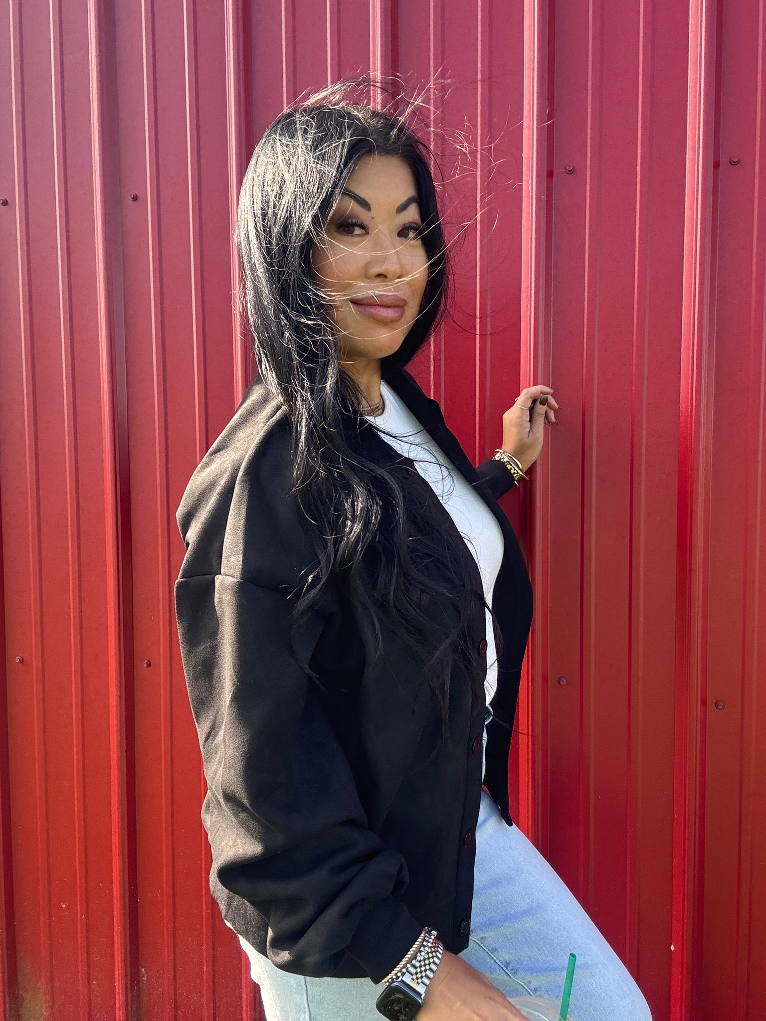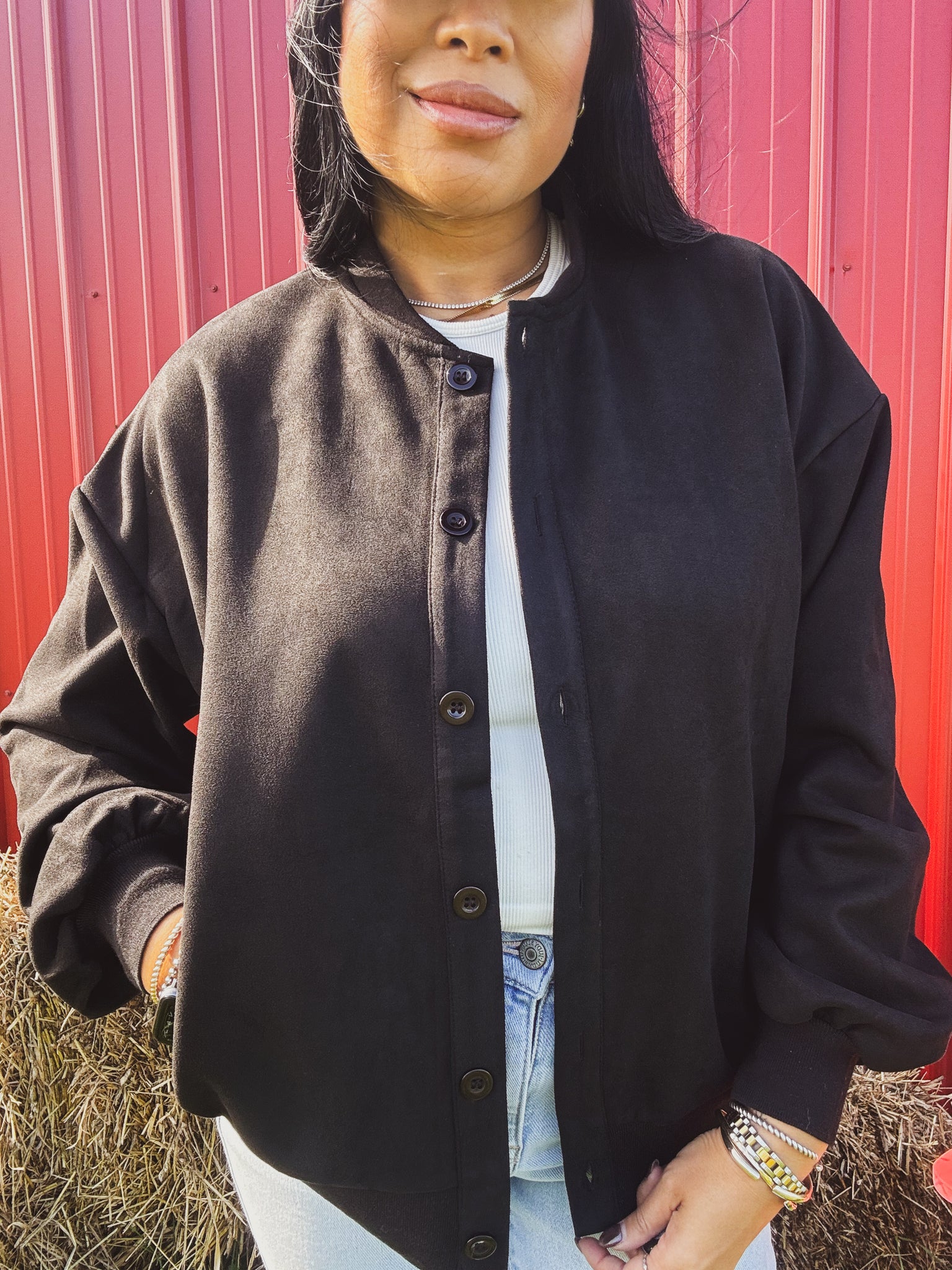 A versatile, collarless button-up bomber jacket crafted for effortless layering. This minimalist black layer features a smooth, microsuede soft-hand fabric with a relaxed, slightly oversized fit that sits at the hip. A clean banded neckline and tonal button front keep the look streamlined, while ribbed cuffs add structure and help seal in warmth. Wear it over tees or knits for polished comfort from weekday to weekend.