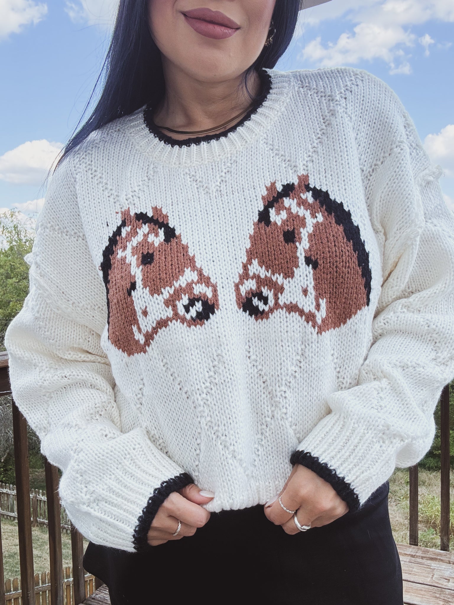 Cozy statement sweater featuring a mirrored horse-head intarsia across the front. Knit in a soft, chunky cream yarn with subtle pointelle detailing, it delivers warmth and texture without feeling bulky. A classic crew neckline, ribbed hem and cuffs, and contrast black tipping add a polished finish. The relaxed, slightly slouchy fit with drop shoulders makes it easy to layer over tees or collared shirts, while the playful equestrian motif gives any outfit a Western-inspired twist.