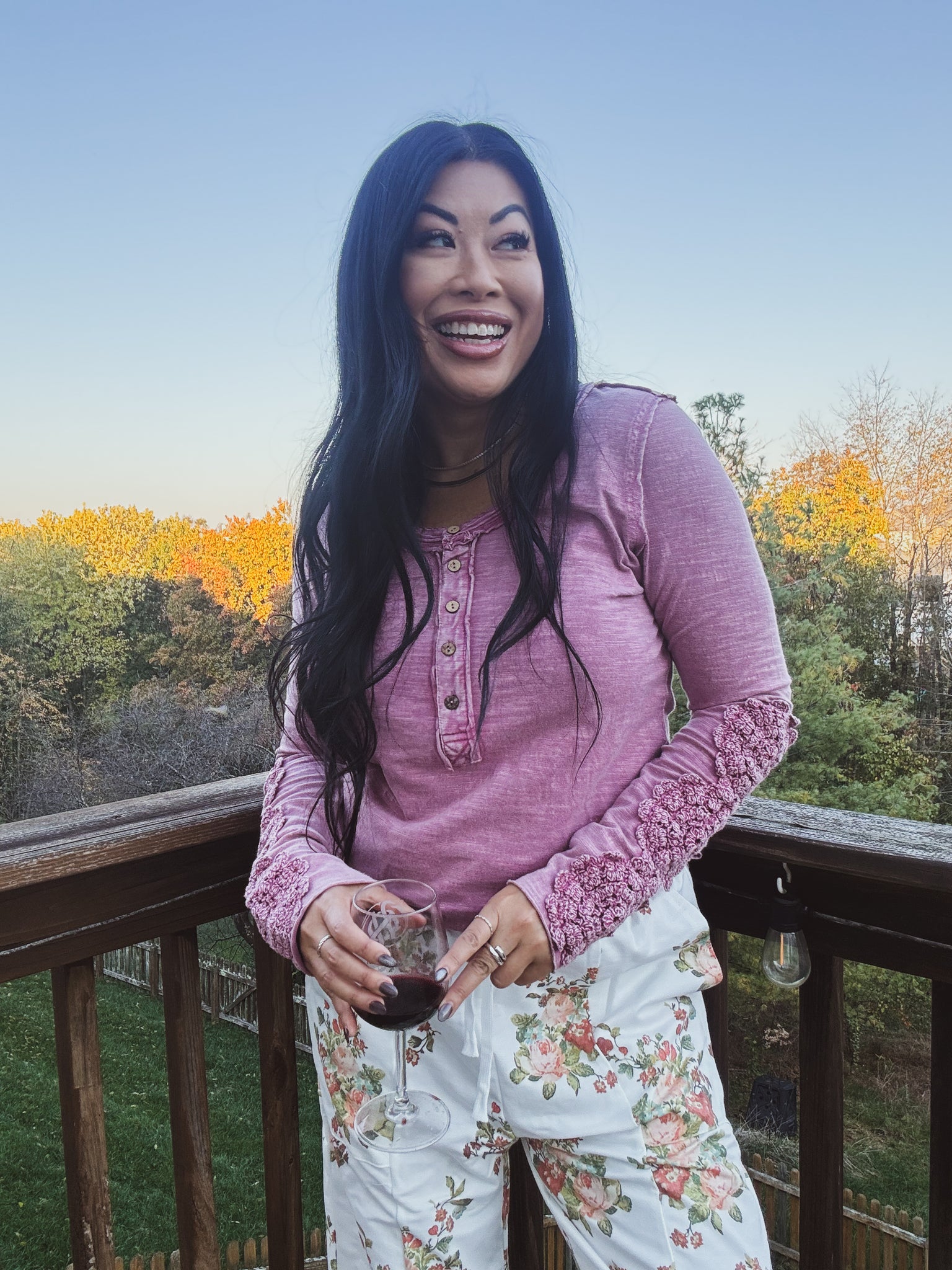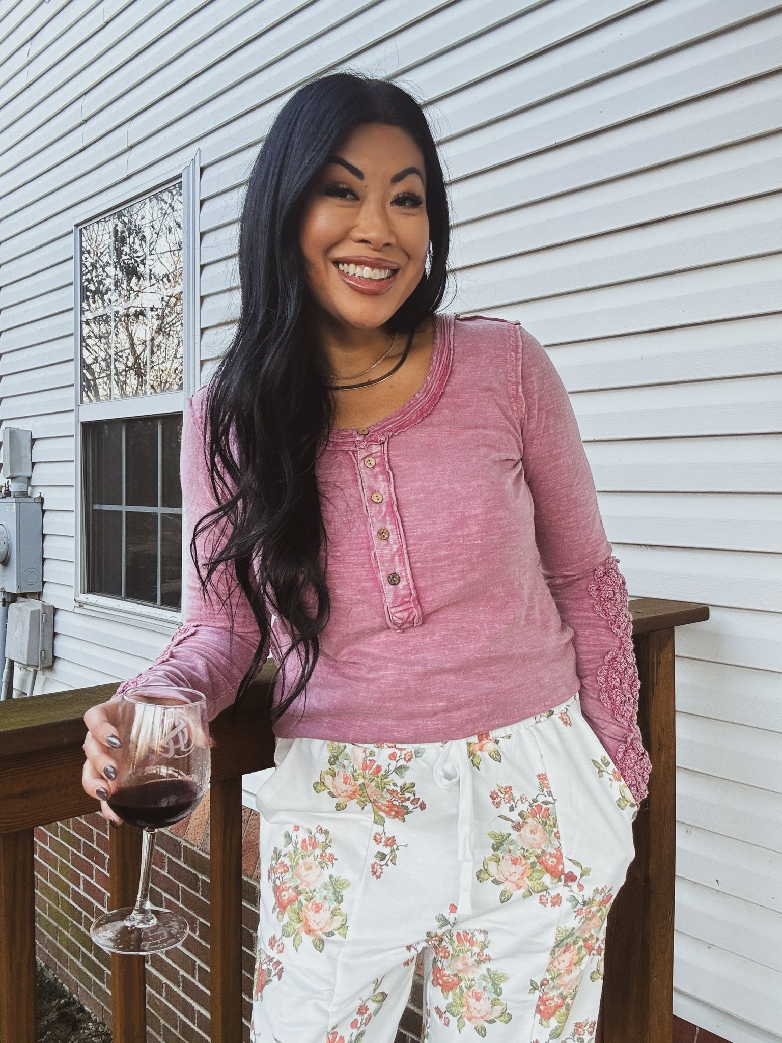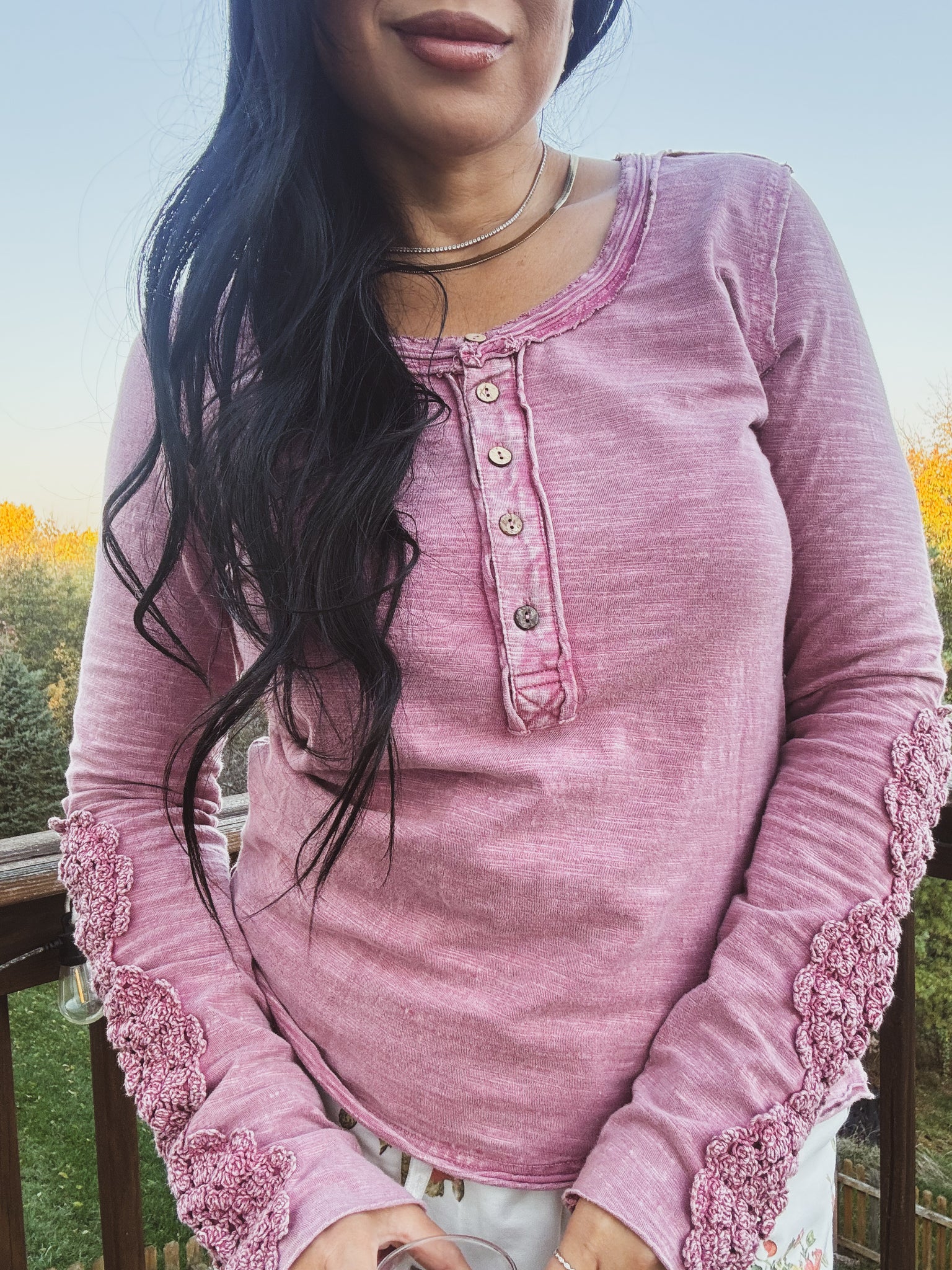 A vintage-inspired long-sleeve Henley top in a soft, garment-washed rose hue. Crafted from a slub-knit fabric for a lived-in feel, it features a scoop neckline with raw-edge detailing and a functional button placket with rustic, wood-look buttons. The standout detail is the intricate crochet applique running down the outer sleeves to the scalloped cuffs, adding feminine, boho charm. Designed with a flattering, slightly fitted silhouette and hip-length hem, it’s an easy layer that dresses up denim or pairs with skirts for day-to-night wear. Key selling points: soft touch, adjustable neckline, unique crochet sleeve trim, and a relaxed-yet-polished look.