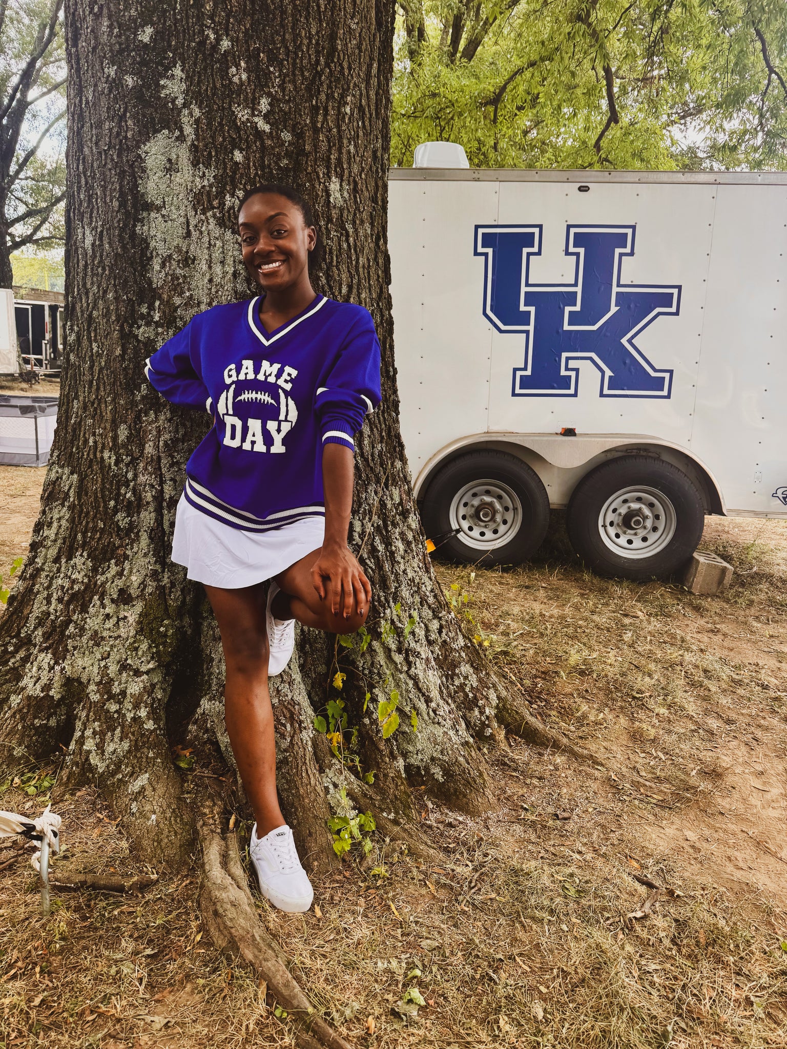 Game Day V‑Neck Varsity Sweater. A classic stadium-ready pullover in bold royal blue with crisp white accents, this midweight knit features a varsity V‑neckline, ribbed cuffs and hem, and striped sleeve detail. The front showcases a high-contrast “GAME DAY” intarsia with a football graphic for an unmistakable spirited look. Cut with a relaxed, easy-to-layer fit that sits at the hip, it delivers cozy warmth without bulk—perfect over tees or collared shirts. Durable ribbing helps retain shape wear after wear, while the timeless collegiate styling pairs effortlessly with skirts, jeans, or leggings. Ideal for tailgates, weekend outings, and every football-filled fall day.