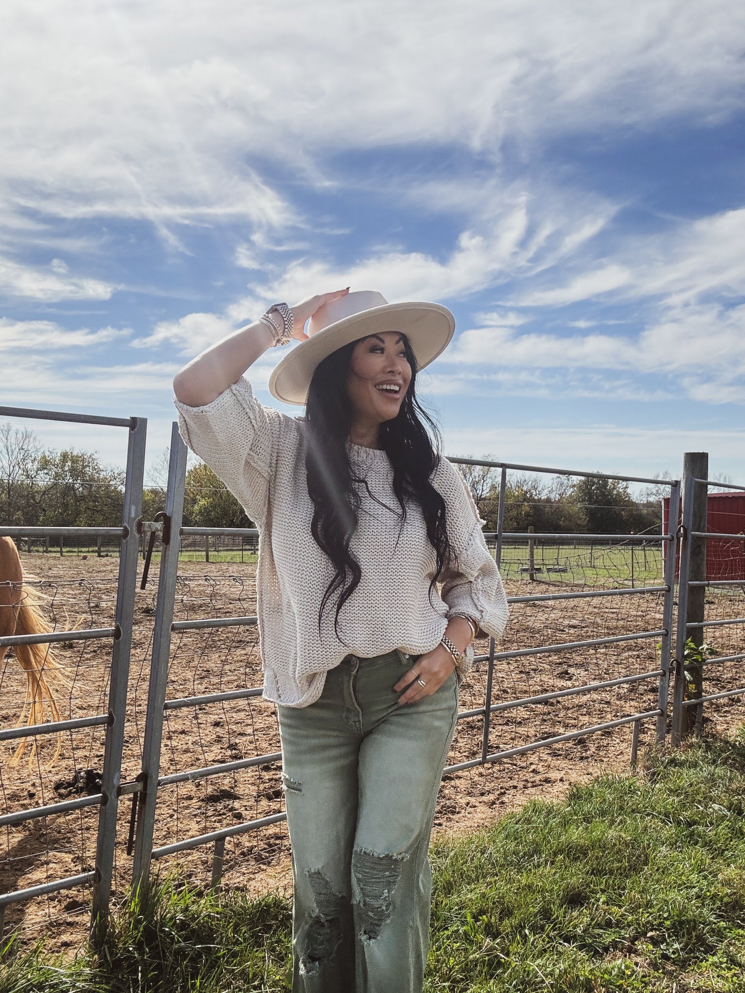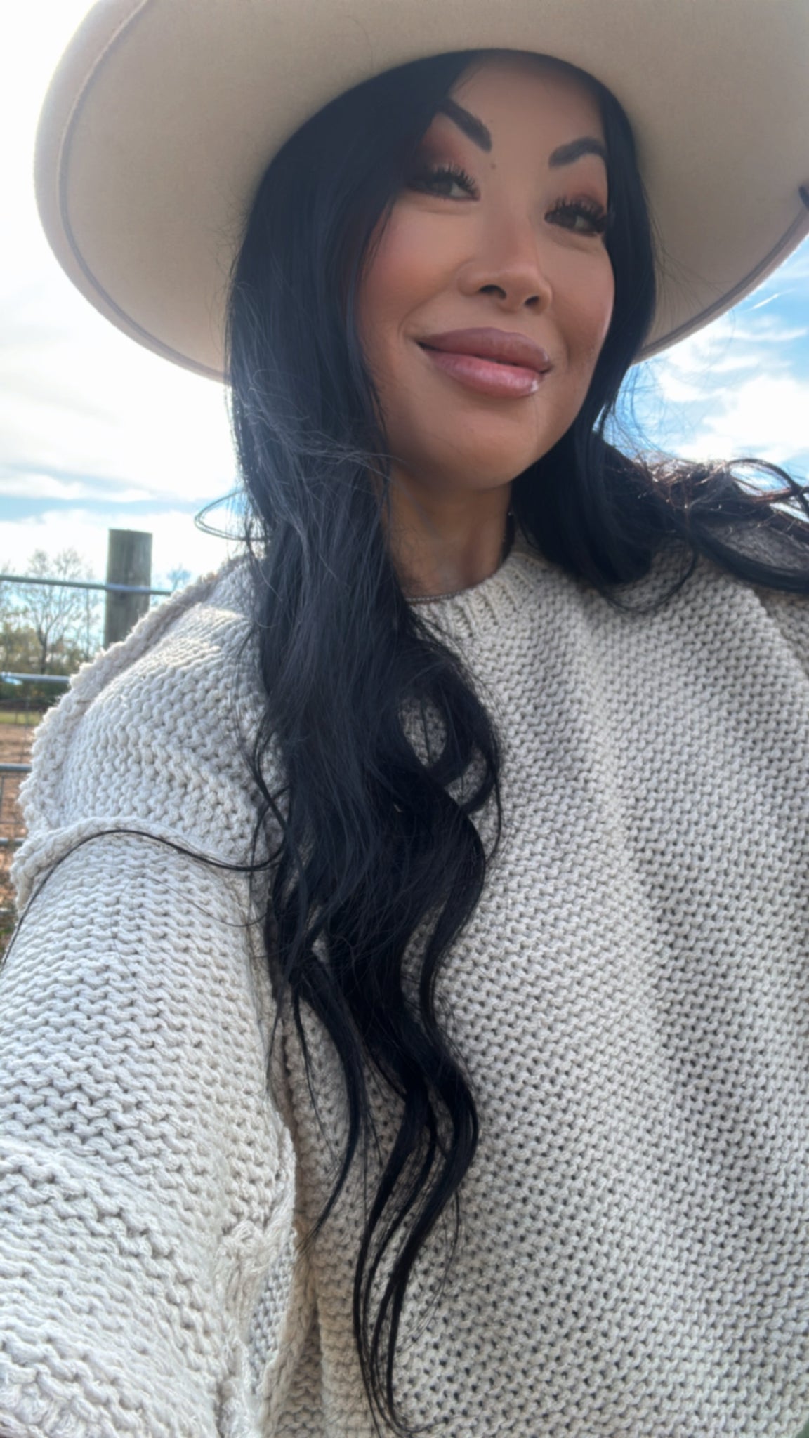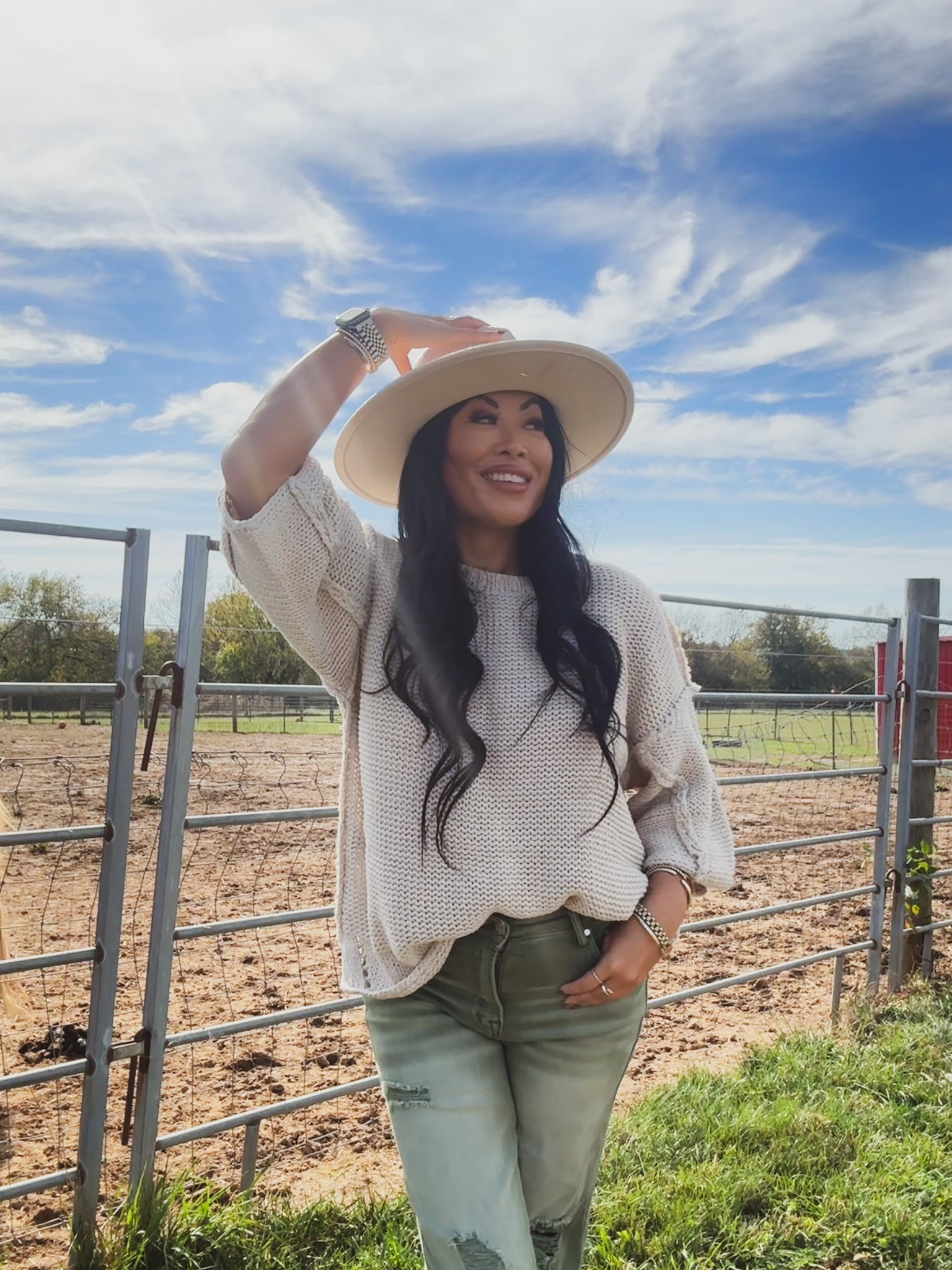Cozy Chunky-Knit Pullover Sweater in Oatmeal. Effortlessly relaxed and ultra-soft, this textured knit features a roomy, oversized silhouette with drop shoulders and 3/4 length sleeves for a laid-back drape. A classic crew neckline and cuffed sleeves add a polished finish, while the hip-skimming length is perfect for a front tuck or worn loose. The neutral oatmeal hue pairs with everything and offers breathable warmth that’s ideal for layering from fall through spring. Your go-to everyday knit for casual outings, travel, and weekend wear.