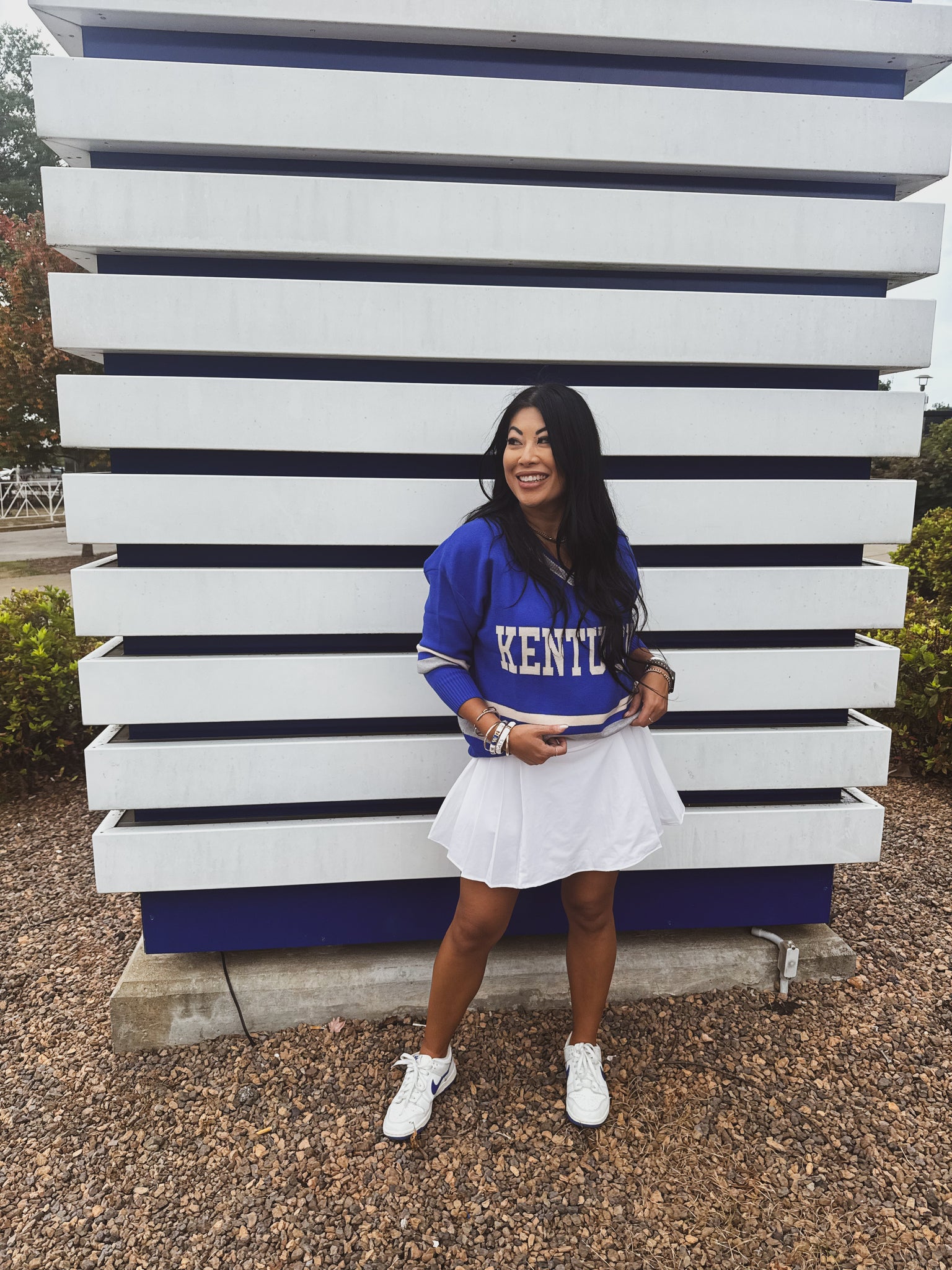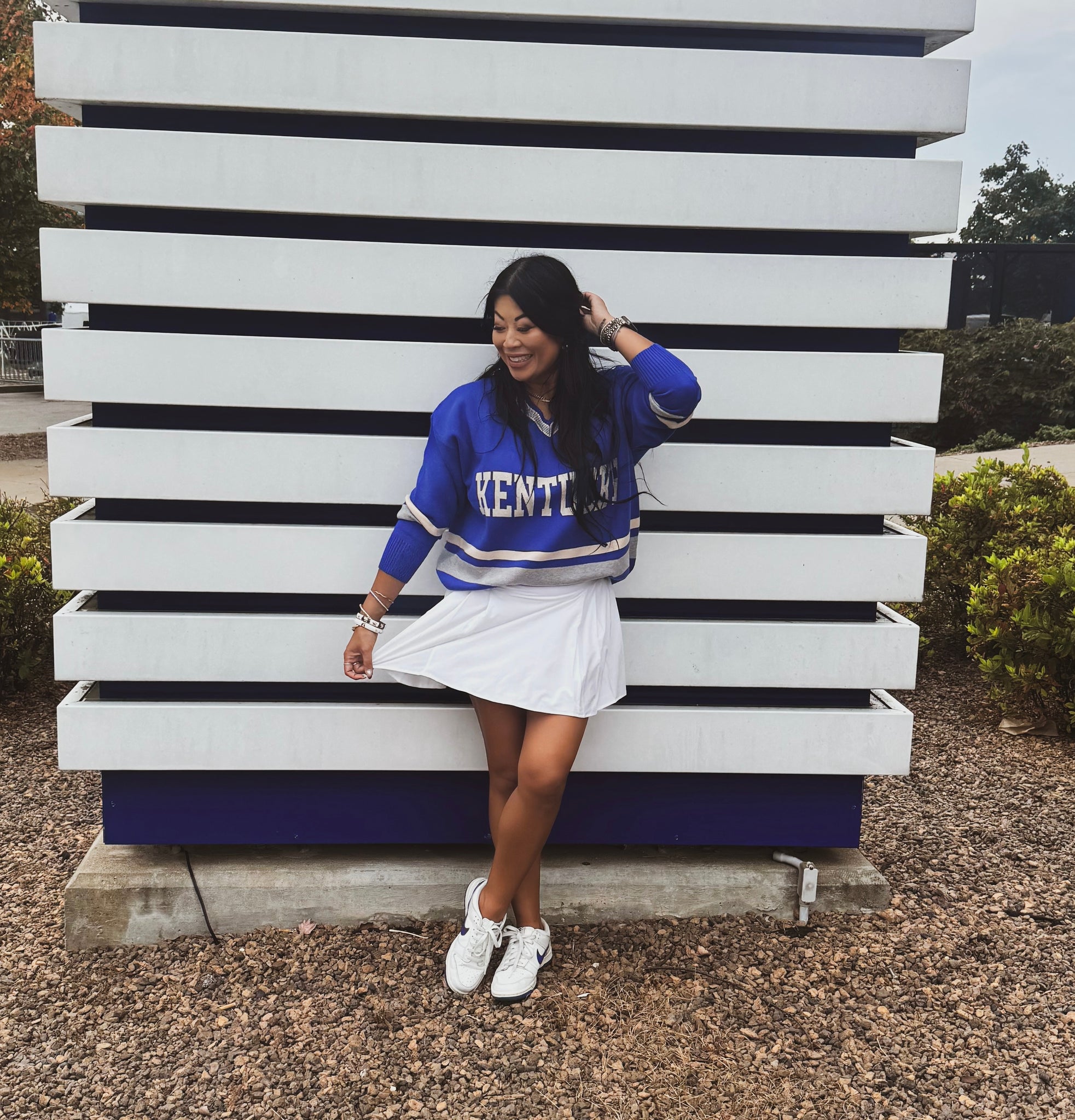 Collegiate-inspired V-neck pullover showcasing bold “KENTUCKY” varsity lettering across the chest. Crafted in a soft, midweight knit for cozy comfort, it features a royal-blue body with cream and heather-gray contrast stripes, plus a striped rib-knit neckline. Ribbed cuffs and hem hold their shape, while the relaxed, easy-to-layer fit makes it perfect for game days, weekends, and casual outfits. A standout piece that pairs effortlessly with denim, leggings, or skirts for spirited style all season long.