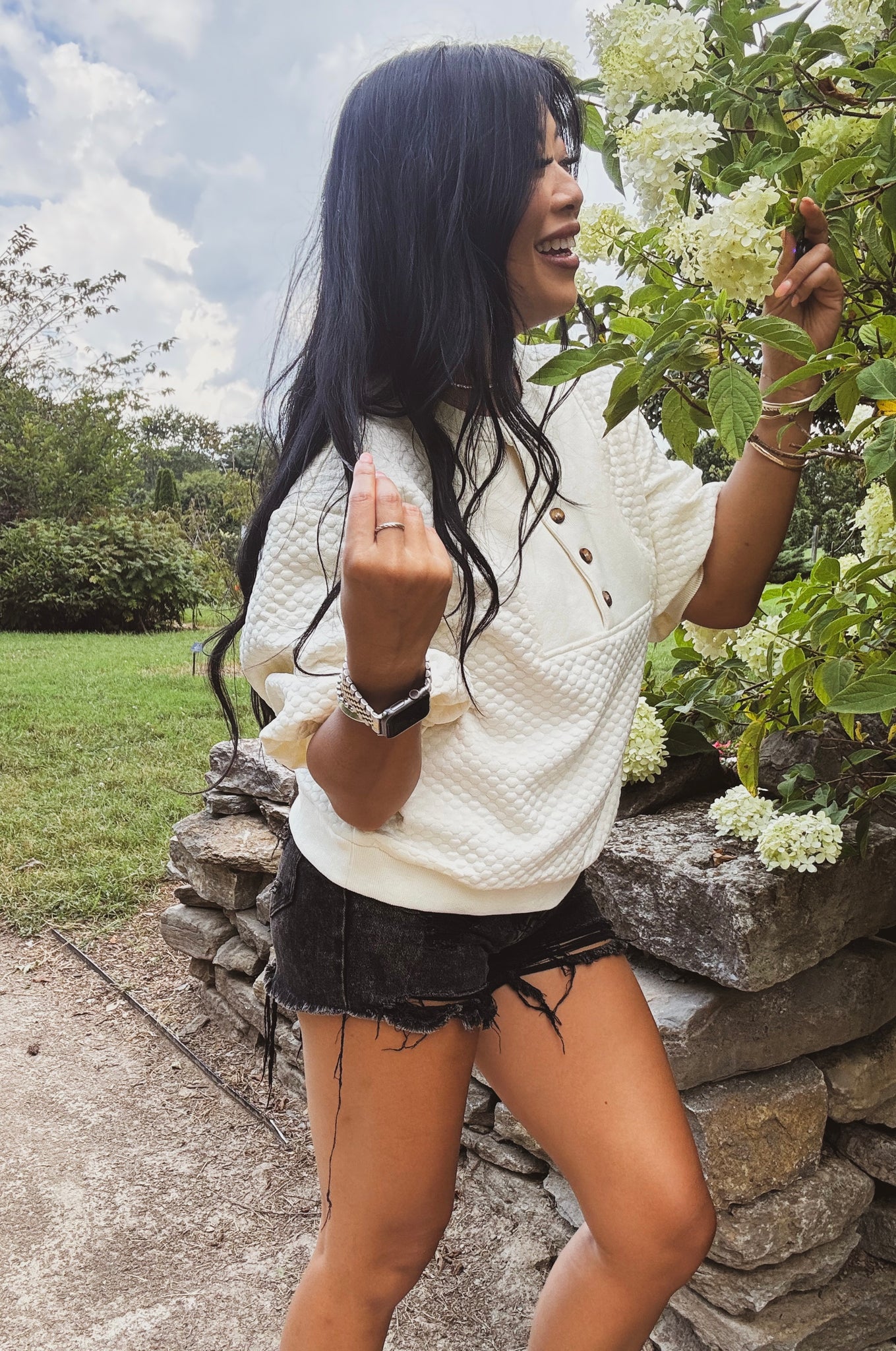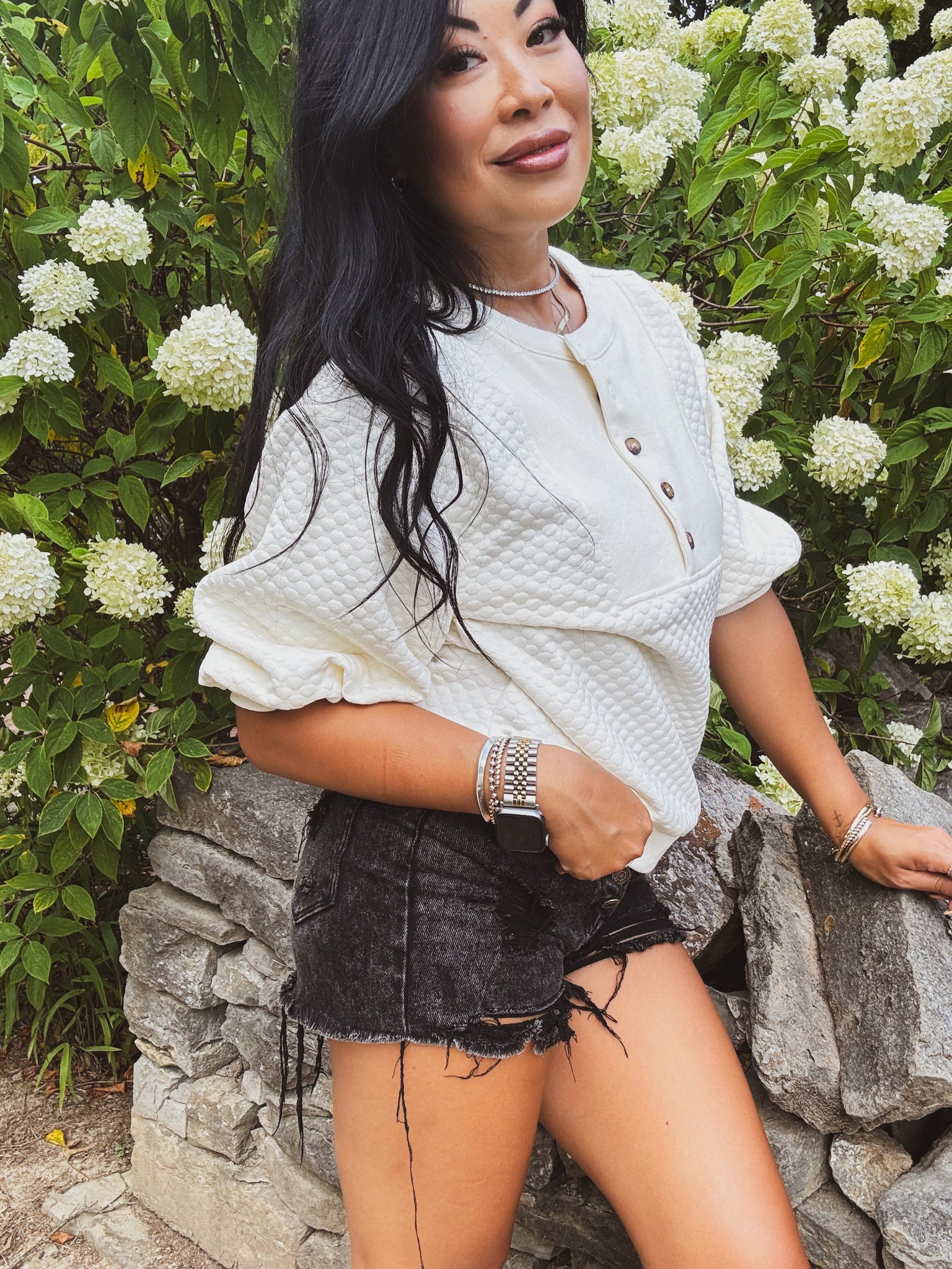 Stay effortlessly cozy and stylish with this textured white pullover sweatshirt, designed for both comfort and fashion-forward appeal. Crafted from soft, quilted fabric with a unique honeycomb pattern, this top features a relaxed fit and roomy sleeves for easy layering. The standout front panel is accented with four metallic snap buttons for a modern henley-inspired touch, making it easy to style up or down. Its ribbed hem and cuffs ensure a secure, flattering fit, while the neutral ivory shade pairs perfectly with any wardrobe, from denim cutoffs to tailored trousers. Perfect for casual outings or laid-back weekends, this versatile piece combines everyday comfort with eye-catching detail, making it a must-have addition to your collection.