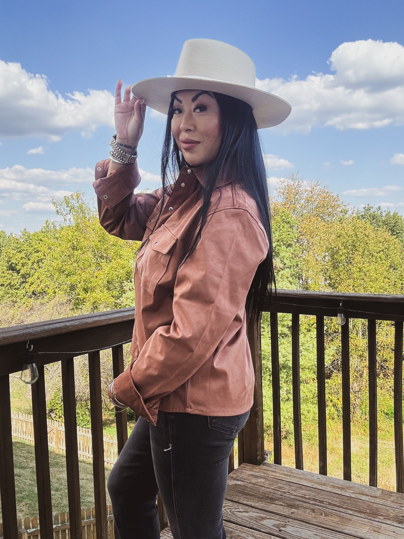 A modern button down shirt with a luxe twist. This long-sleeve snap-front top features a rich rust/copper tone and a subtle satin-like sheen that elevates everyday outfits. Designed with a classic point collar, two oversized flap chest pockets, and polished metal snap closures down the placket and cuffs, it blends Western-inspired details with contemporary polish. The relaxed, slightly structured fit drapes smoothly for easy tucking or layering, making it versatile as a standalone blouse or a lightweight shacket. Soft, midweight fabric offers all‑day comfort while maintaining a refined look. Pair with denim for casual days or style with trousers and boots for a night out.