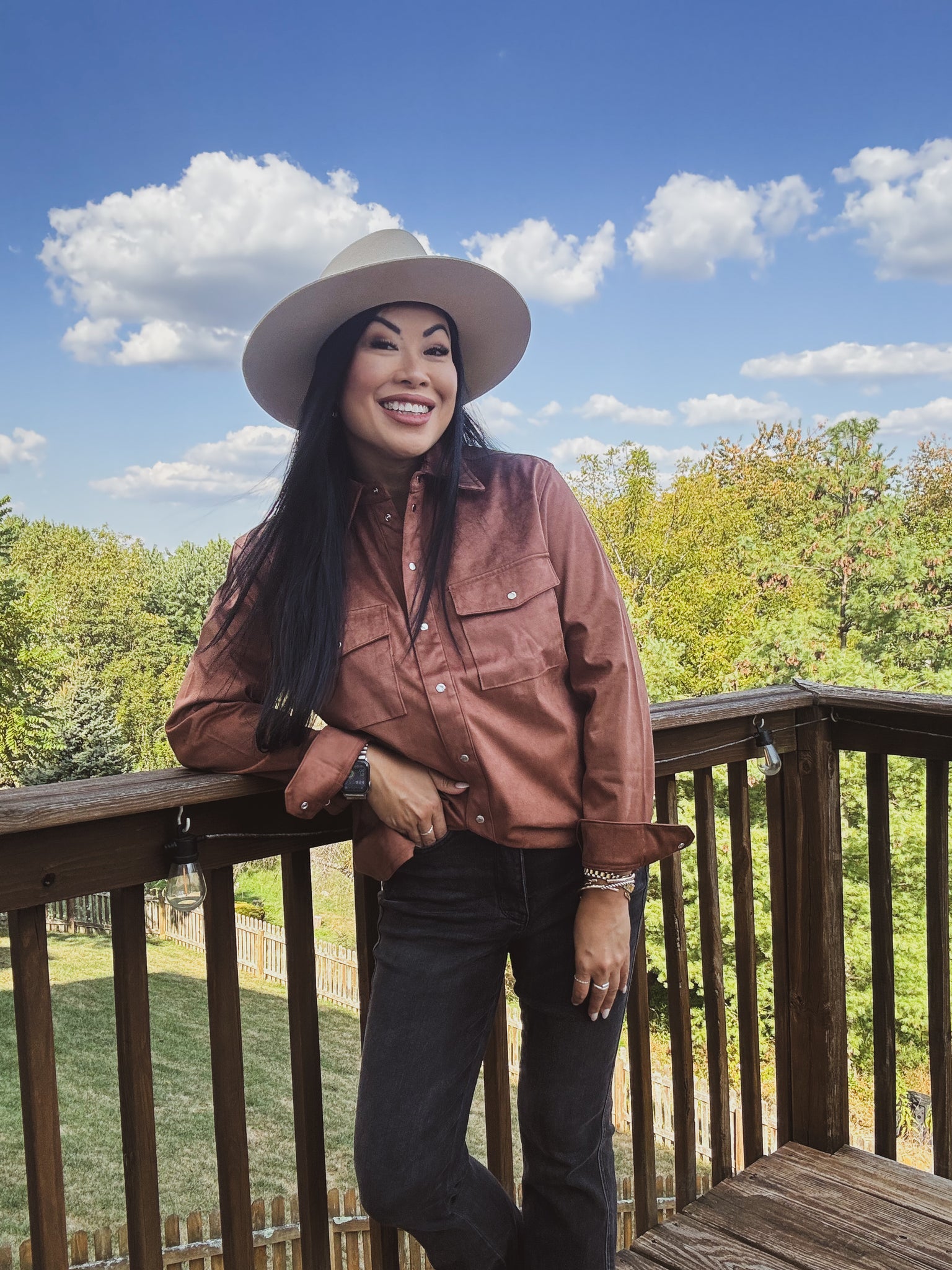- Warm rust/copper color that complements neutrals and denim