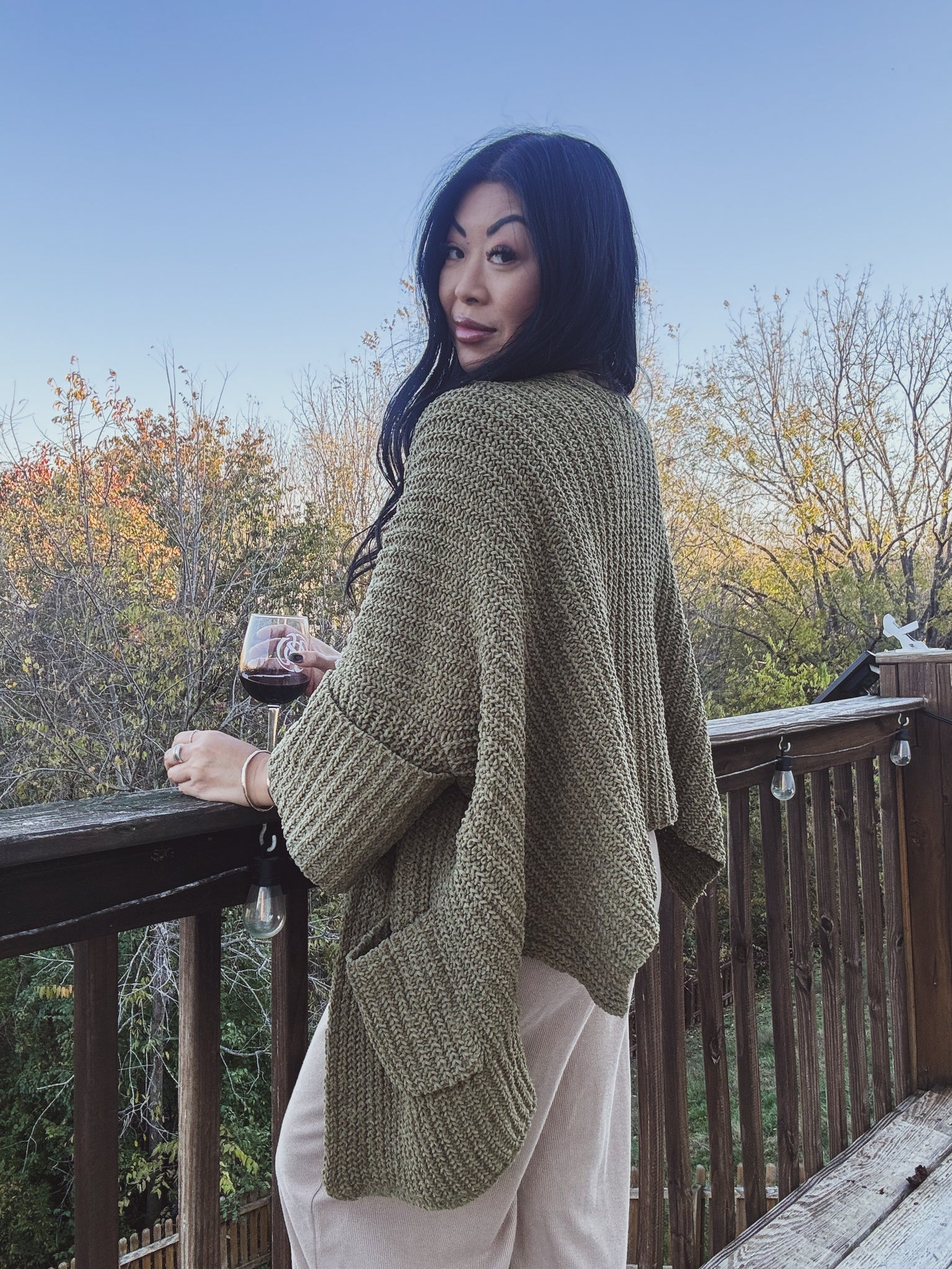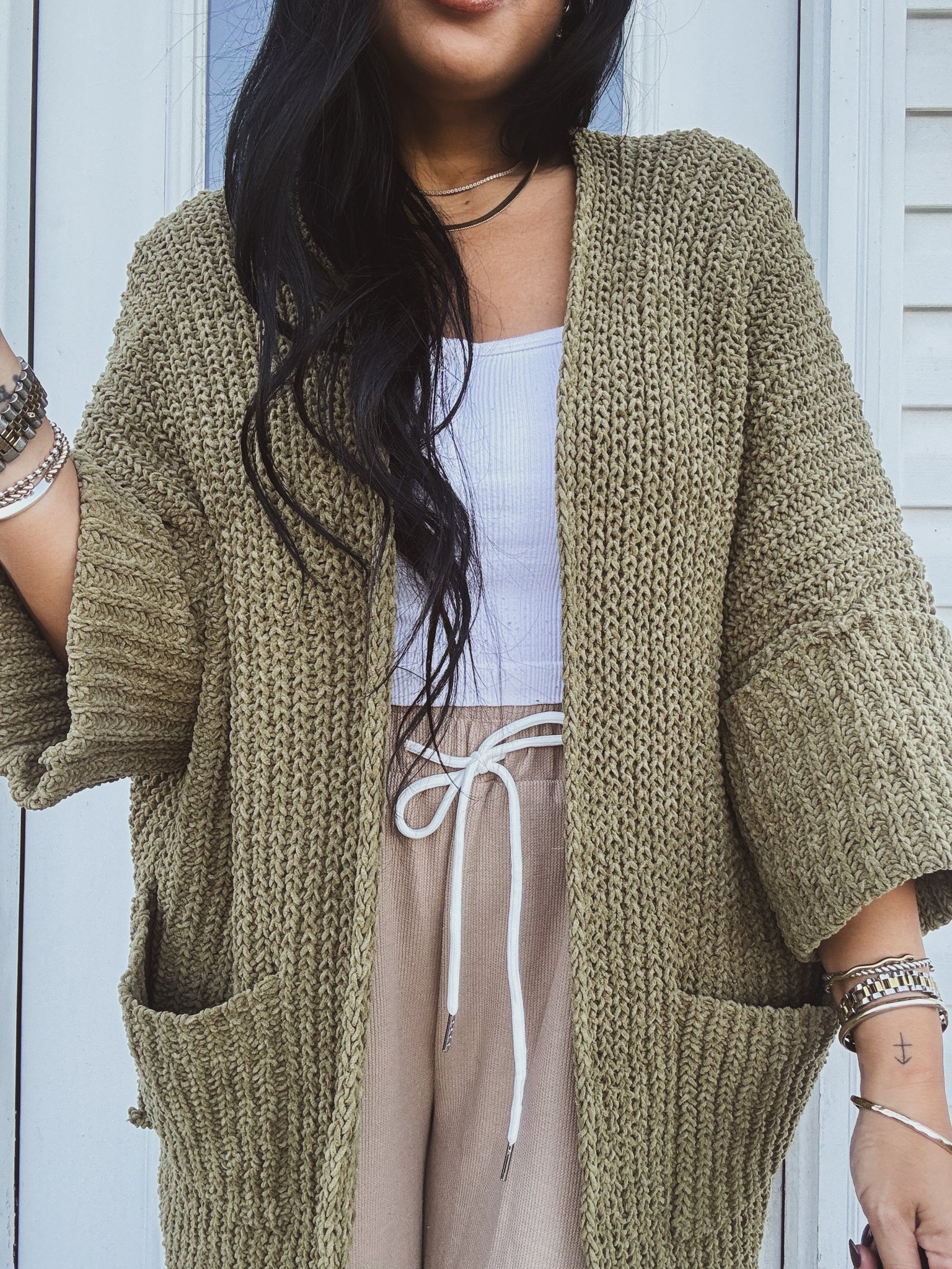 Cozy open-front cardigan in a chunky, textured knit chenille fabric with an easy, oversized fit. Designed for effortless layering, it features drop shoulders, wide sleeves, and a longline silhouette that hits around mid-thigh for extra coverage. Two deep front patch pockets keep essentials close while ribbed trim at the cuffs and hem adds structure. So cozy you’ll never want to take it off! Finished in a versatile olive/moss hue that pairs with denim, joggers, or dresses for year-round wear. Ideal for work-to-weekend comfort and laid-back polish.