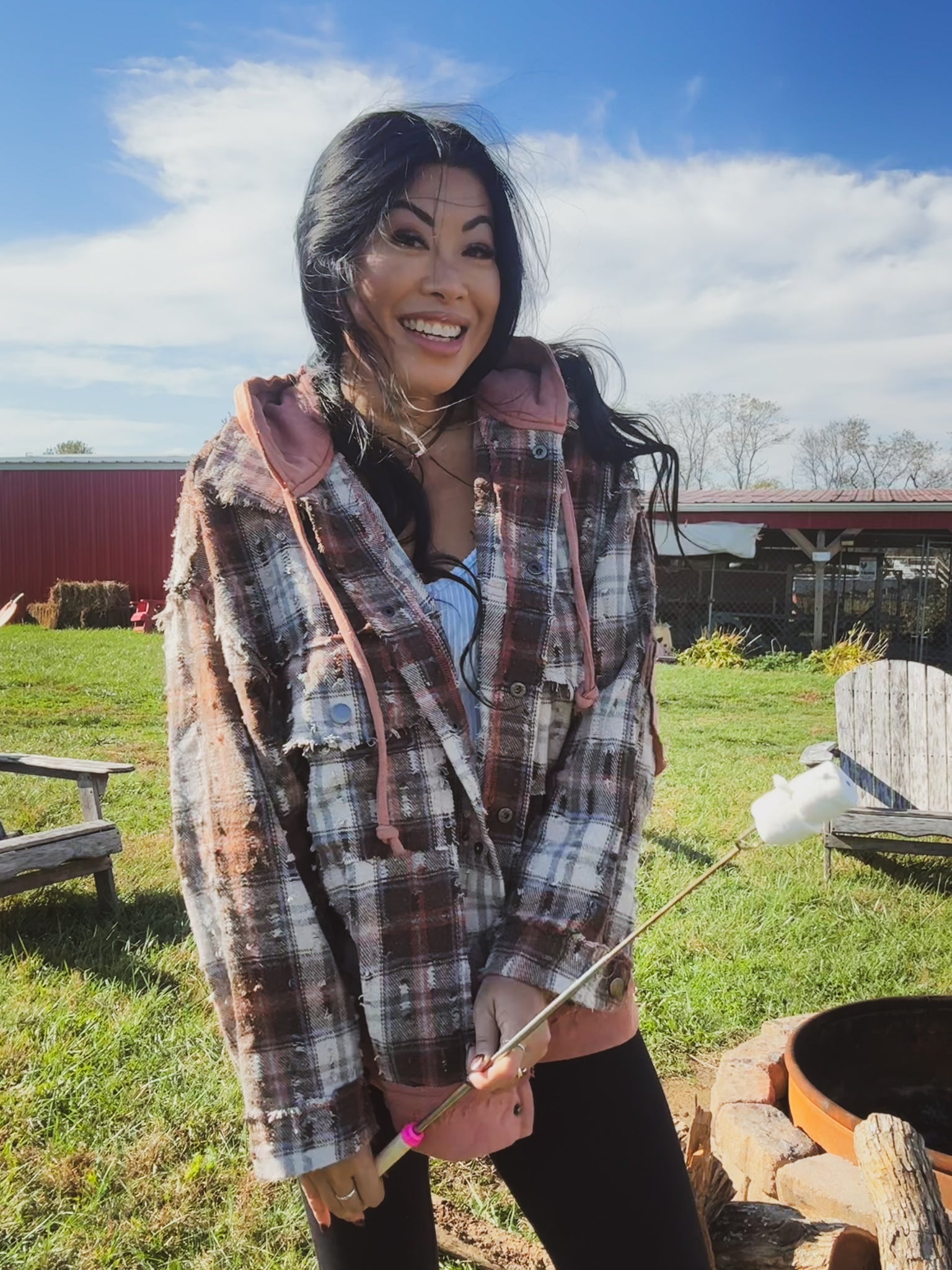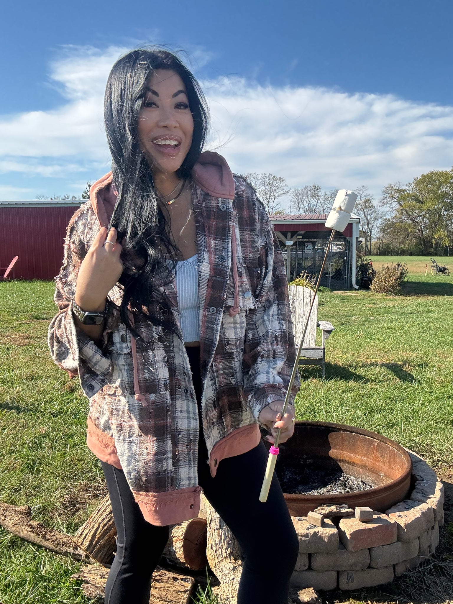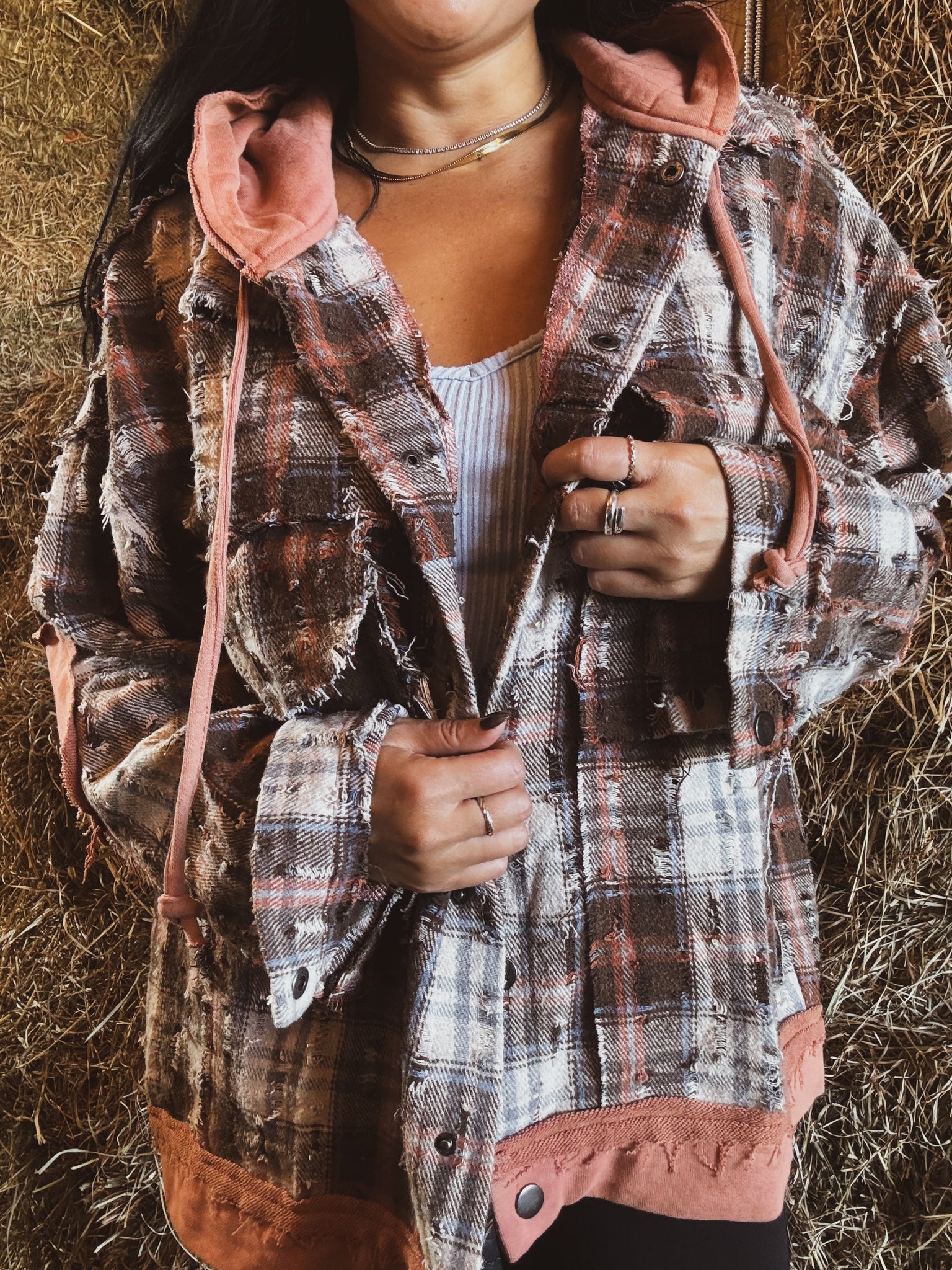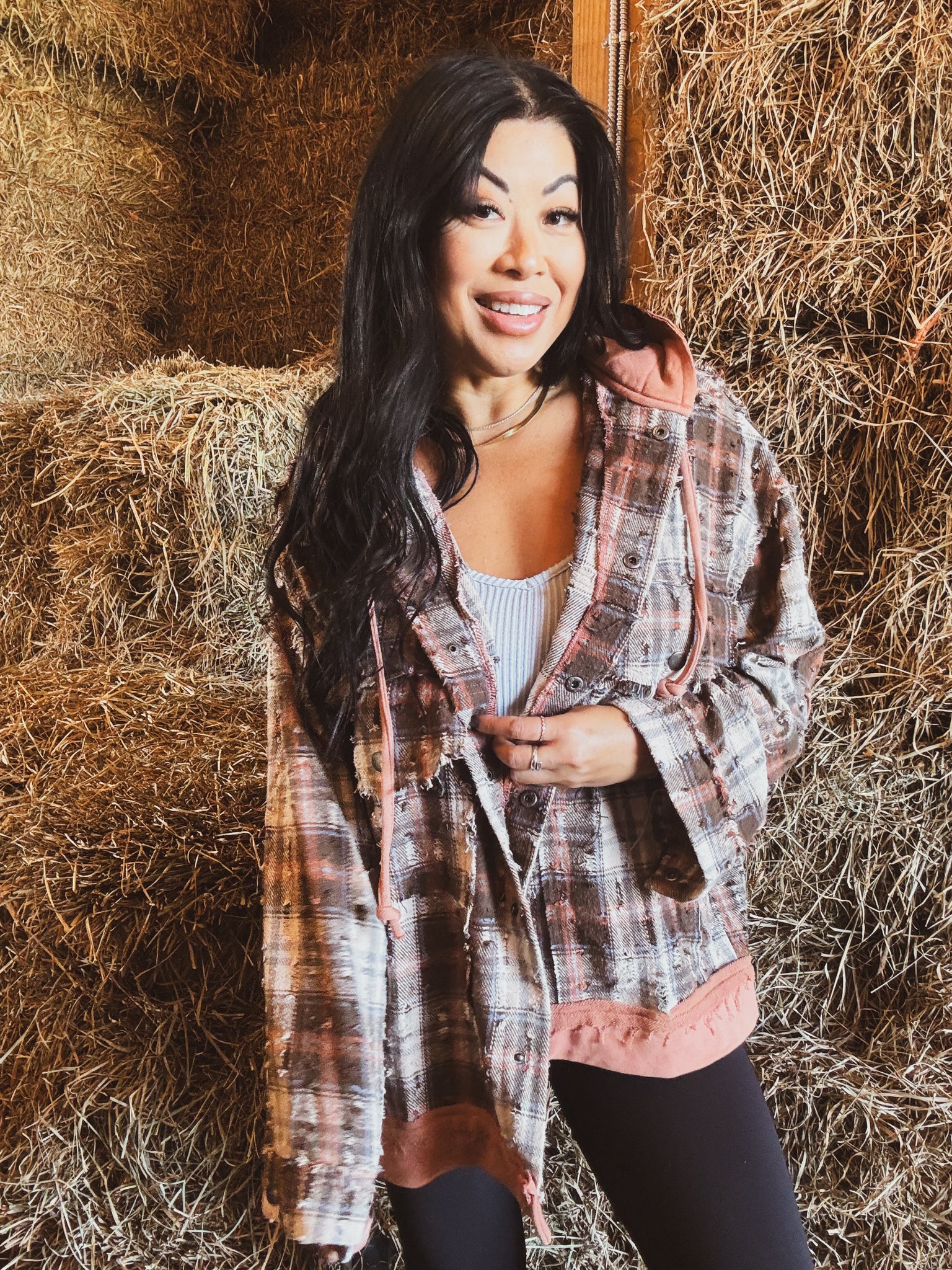 Cozy plaid hooded shacket with a lived‑in, vintage vibe. Crafted from soft, brushed flannel in warm earthy tones, it features an attached sweatshirt-style hood and contrast hem in dusty rose for a layered look without the bulk. The relaxed, oversized silhouette with drop shoulders makes it an easy throw-on piece for transitional weather. Distressed details and raw edges add character, while the button-front design lets you wear it open or closed for versatile styling. Perfect with leggings or denim for casual days, outdoor events, and weekend layering.