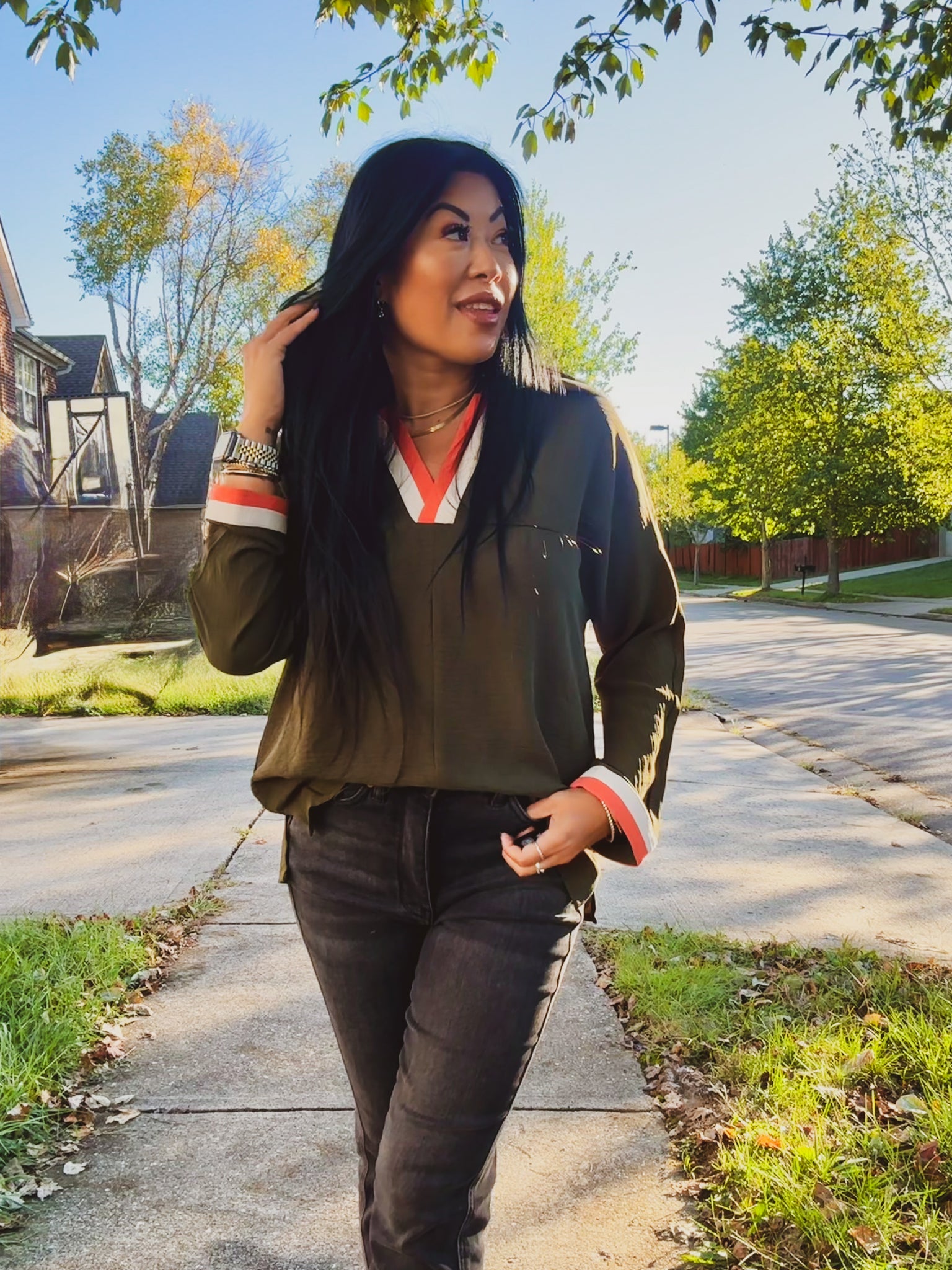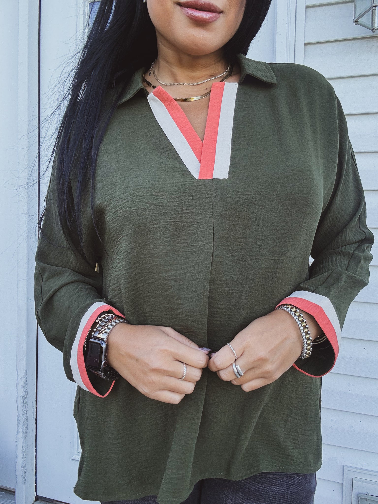 Effortless, polished, and easy to wear, this long-sleeve blouse features a relaxed silhouette in a deep olive green with statement contrast trim. A notched V-neckline is outlined in crisp ivory and coral, echoed at the cuffs for a coordinated pop of color. Crafted from a soft, lightweight, textured woven fabric, it drapes beautifully without clinging and offers all-day comfort. A clean center-front seam adds subtle structure, while the hip-length hem makes it simple to half-tuck or wear loose. Pull-on design—no buttons or zips—means quick, fuss-free styling. Dress it up with tailored pants for work or pair with denim for weekend ease.